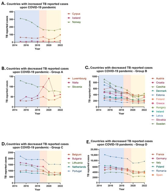 Tuberculosis (TB) annually reported cases in the European Union/European Economic area (EU/EEA) from 2015 to 2022. (A) Countries with increased TB reported cases upon COVID-19 pandemic. (B) Countries with decreased TB reported cases upon COVID-19 pandemic (group A). (C) Countries with decreased TB reported cases upon COVID-19 pandemic (group B). (D) Countries with decreased TB reported cases upon COVID-19 pandemic (group C). (E) Countries with decreased TB reported cases upon COVID-19 pandemic (group D).