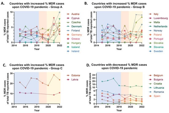 Percentage rates of multidrug-resistant (MDR) tuberculosis (TB) annually reported cases in the European Union/European Economic area (EU/EEA) from 2015 to 2022. (A) Countries with increased % MDR reported cases upon COVID-19 pandemic (group A). (B) Countries with increased % MDR reported cases upon COVID-19 pandemic (group B). (C) Countries with increased % MDR reported cases upon COVID-19 pandemic (group C). (D) Countries with decreased % MDR reported cases upon COVID-19 pandemic.