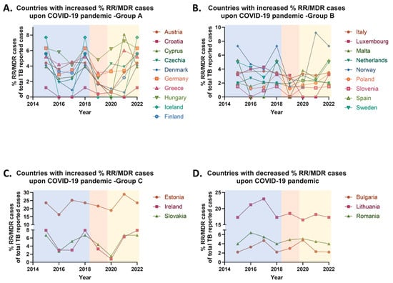 Percentage rates of rifampicin-resistant/multidrug-resistant (RR/MDR) tuberculosis (TB) annually reported cases in the European Union/European Economic area (EU/EEA) from 2015 to 2022. (A) Countries with increased % RR/MDR reported cases upon COVID-19 pandemic (group A). (B) Countries with increased % RR/MDR reported cases upon COVID-19 pandemic (group B). (C) Countries with increased % RR/MDR reported cases upon COVID-19 pandemic (group C). (D) Countries with decreased % RR/MDR reported cases upon COVID-19 pandemic.