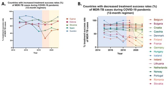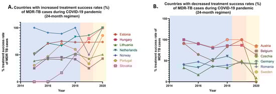 Percentage rates of treatment success of multidrug resistant (MDR) tuberculosis (TB) annually reported cases in the European Union/European Economic area (EU/EEA) from 2015 to 2020, in a 24-month therapeutic regimen. (A) Countries with increased treatment success rates (%) of MDR TB cases during COVID-19 pandemic. (B) Countries with decreased treatment success rates (%) of MDR TB cases during COVID-19 pandemic.