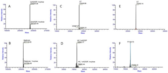 In addition to N-glycan analysis, all other analyses were performed on an LC-MS system configured with a Thermo Fisher Scientific™ Vanquish™ Flex UHPLC (Waltham, MA, USA) and a Q Exactive™ Plus mass spectrometer (Waltham, MA, USA) equipped with a heated electrospray ionization (HESI) interface. For intact and HC-LC chain analysis, a Mabpac RP (2.1 × 50 mm, 4 µm) column was used. For peptide mapping, an ACQUITY UPLC BEH peptide C18 (2.1 mm × 150 mm, 1.7 μm) from Waters (Milford, MA, USA) was used. Except for the columns used for peptide mapping, all the instruments and columns used were from Thermo Fisher (Sunnyvale, CA, USA). The LC conditions for intact protein, HC-LC chain, and peptide mapping analysis are shown in Table 1.