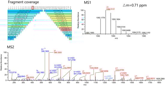 MS1 and MS2 spectra of xylose-modified peptides. High sequence coverage of the resulting peptides and identified Ser 468 in red box as the modification site bearing the 132.042 Da group was achieved. This modification is tentatively assigned as xylose moiety (C5H10O5, theoretical mass: 132.042 Da).