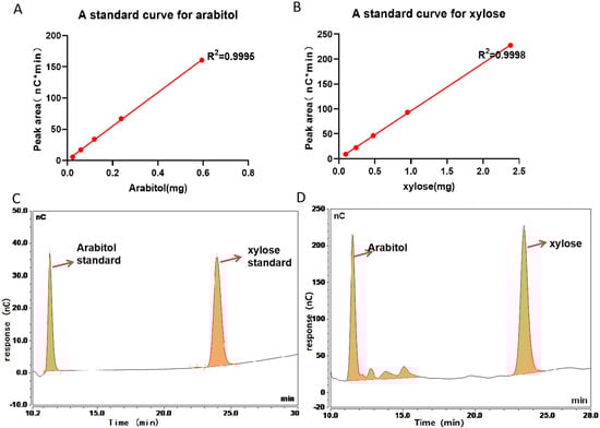 If the modification of 132.042 Da is xylose, it can be released by β-elimination and detected via the HPAEC-PAD method. Arabitol was added to the test samples as an internal spiking standard. The contents of xylose were quantitatively estimated via this method. A calibration curve was obtained for xylitol and xylose at 5 different concentrations (0.0238, 0.0595, 0.119, 0.238, and 0.595 μg), and the absorbance of each sample was measured via pulsed amperometric detection to obtain the following linear equations: Y = 122.5 × X − 0.5715 (R2 = 0.9994) and Y = 194.9 × X + 0.1169 (R2 = 0.9998), respectively (Figure 4A,B). xylose was identified as a major constituent of the extracts from the chromatographic analysis of the BsAbs according to the described procedure. The Standards of 0.119 μg of sugars was presented in Figure 4C. Except for those visible in the chromatograms (Figure 4D), significant signals of O-glycosylation compounds were not observed.