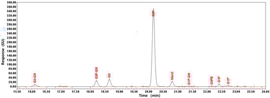 N-glycosylation is also important modification of antibodies. After the analysis of molecular weight, light chain, heavy chain, peptide sequence coverage and O-glycosylation, N-glycosylation were detected by HILIC-HPLC. As shown in Figure 5, galactose-zero (G0) with core fucosylation (F) (G0F) was the most abundant N-glycan (76%). In addition to the glycoforms G0F, G0-GlcNAc, G0F-GlcNAc, G0, G1F, and Man5 also presented a low abundance (<10%), exhibiting negligible effects on Fc region function.