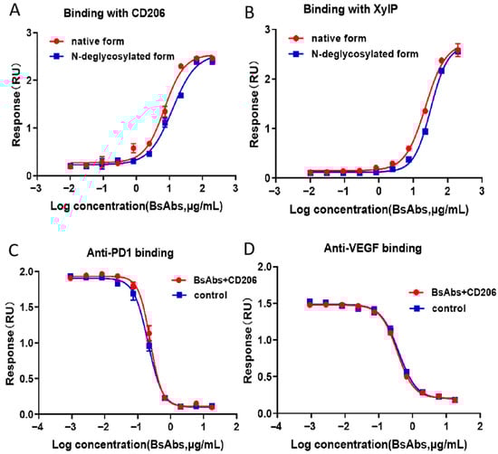Results of the ELISA-based assay profiles. (A) Native BsAbs and enzymatically N-deglycosylated BsAbs can bind to MR, and the EC50 values were approximately 5 μg/mL and 9 μg/mL, respectively. (B) Native BsAbs and an enzymatically N-deglycosylated BsAb can bind XylP, and the EC50 values were approximately 23 μg/mL and 32 μg/mL, respectively. (C) Under identical experimental conditions, BsAbs binding both MR-binding and non-MR-binding BsAbs targeting PD-1 showed no significant differences in binding affinity, demonstrating comparable four-parameter logistic curves. (D) Under identical experimental conditions, BsAbs binding both MR-binding and non-MR-binding BsAbs targeting VEGF showed no significant differences in binding affinity, demonstrating comparable four-parameter logistic curves. The error bars represent the means ± SDs from three experiments.