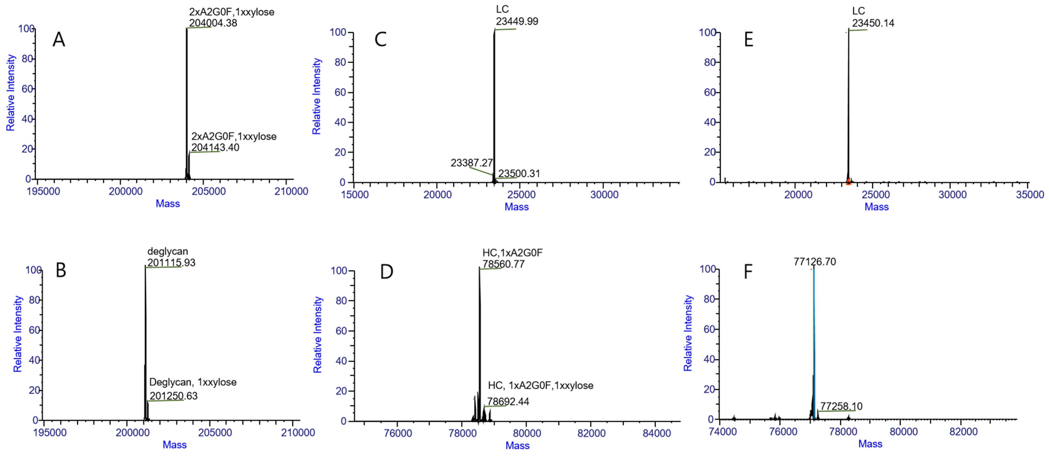 Figure 2. LC/MS intact mass measurement results for intact proteins (A,B), light chains (C,E) and heavy chains (D,F). (A) was obtained with a N-glycosylation protein of about 204,004.38 Da, to further localize the 139 Da modification within the protein about 204,143.40 Da. (B) was obtained with N-deglycosylation protein of about 201,115.93 Da, to further localize the 135 Da modification within the protein about 201,250.63 Da. (C) was obtained with a N-glycosylation protein with LCs and no modification within the LC. (D) was obtained with a N-glycosylation protein with HCs of about 78,560.77 Da, to further localize the 132 Da modification within the protein at about 78,692.44 Da. (E) was obtained with a N-deglycosylation protein with LCs and no modification within the LC. (F) was obtained with N-deglycosylation protein with HCs of about 77,126.70 Da, to further localize the 132 Da modification within the protein of about 77,258.10 Da. These data demonstrate that the protein contains a modification of approximately 132 Da, which persists after N-deglycosylation treatment.