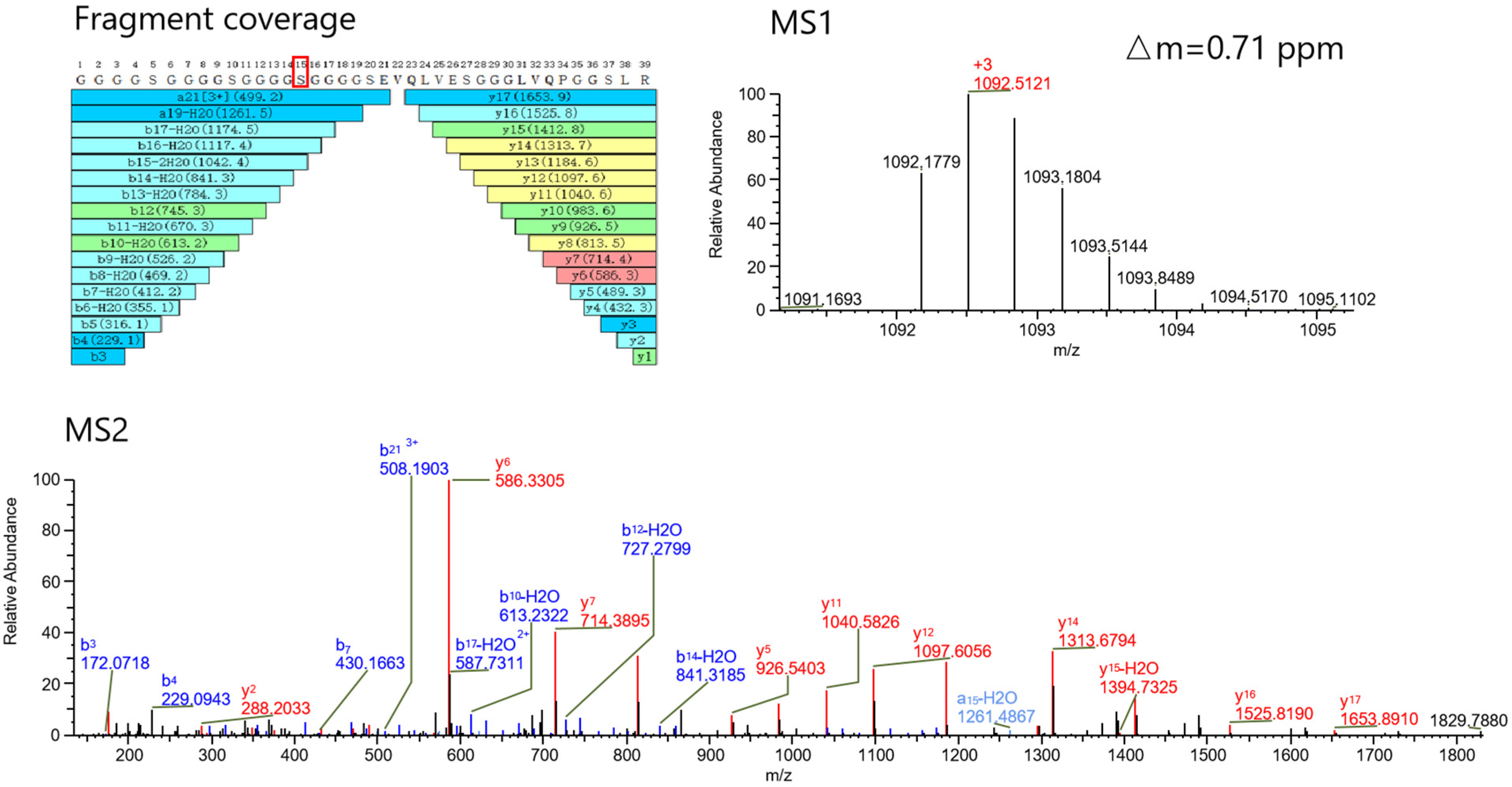 Figure 3. MS1 and MS2 spectra of xylose-modified peptides. High sequence coverage of the resulting peptides and identified Ser 468 in red box as the modification site bearing the 132.042 Da group was achieved. This modification is tentatively assigned as xylose moiety (C5H10O5, theoretical mass: 132.042 Da).