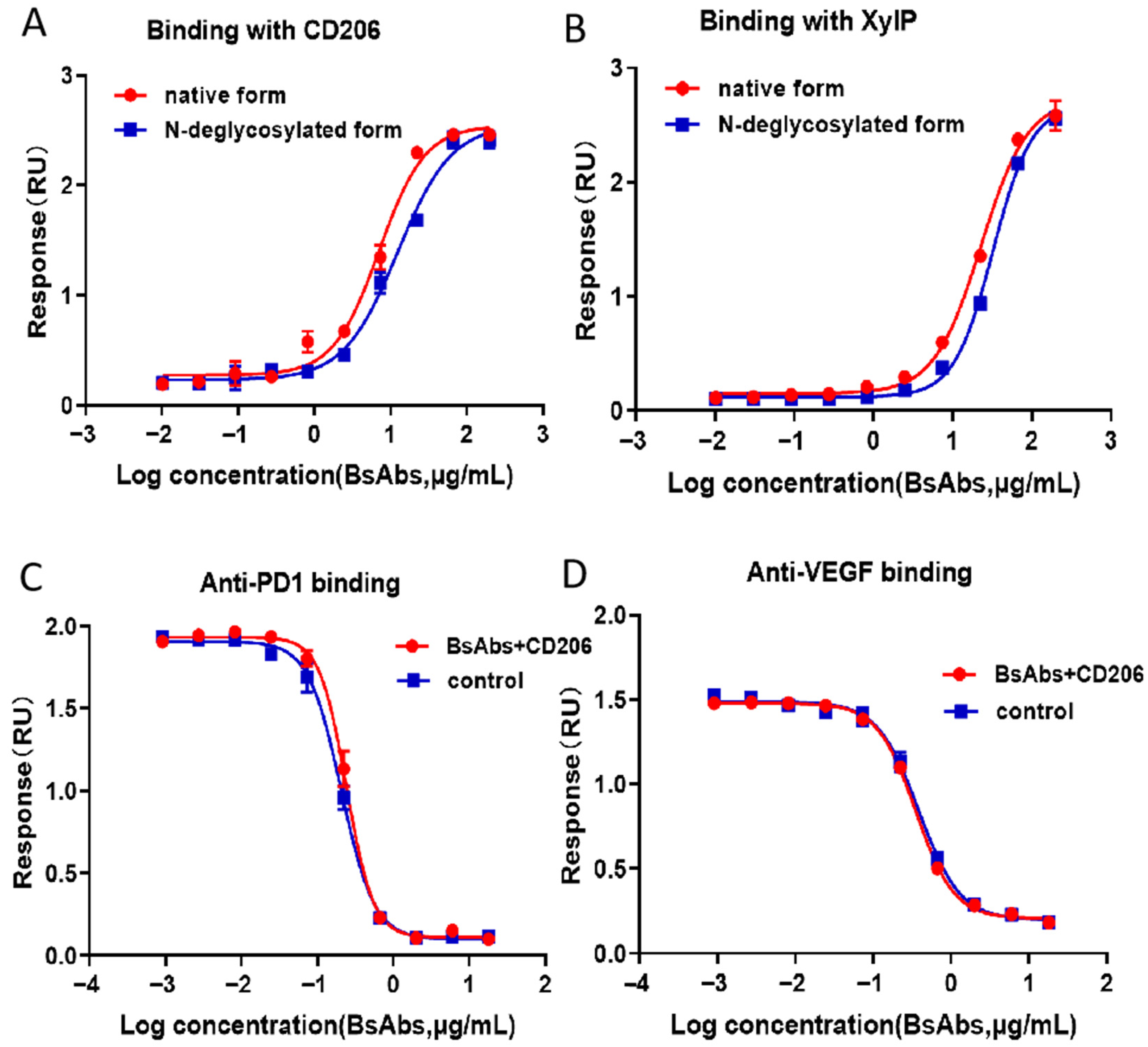 Figure 6. Results of the ELISA-based assay profiles. (A) Native BsAbs and enzymatically N-deglycosylated BsAbs can bind to MR, and the EC50 values were approximately 5 μg/mL and 9 μg/mL, respectively. (B) Native BsAbs and an enzymatically N-deglycosylated BsAb can bind XylP, and the EC50 values were approximately 23 μg/mL and 32 μg/mL, respectively. (C) Under identical experimental conditions, BsAbs binding both MR-binding and non-MR-binding BsAbs targeting PD-1 showed no significant differences in binding affinity, demonstrating comparable four-parameter logistic curves. (D) Under identical experimental conditions, BsAbs binding both MR-binding and non-MR-binding BsAbs targeting VEGF showed no significant differences in binding affinity, demonstrating comparable four-parameter logistic curves. The error bars represent the means ± SDs from three experiments.
