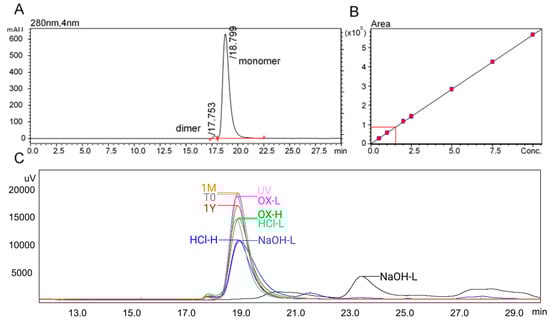 SEC-UV chromatogram of tislelizumab (A) at time zero showing 99.05% monomer (18.80 min) and 0.95% dimer (17.75 min) content. (B) Tislelizumab was quantifiable between 0.5 and 10 mg/mL (r = 0.99999; 0.86%RSD), with a time zero concentration of 1.535 mg/mL (95.94% recovery from a nominal 1.6 mg/mL – including transfer into IV bags). Loss of monomer content, from both time and chemical degradation is shown in (C).