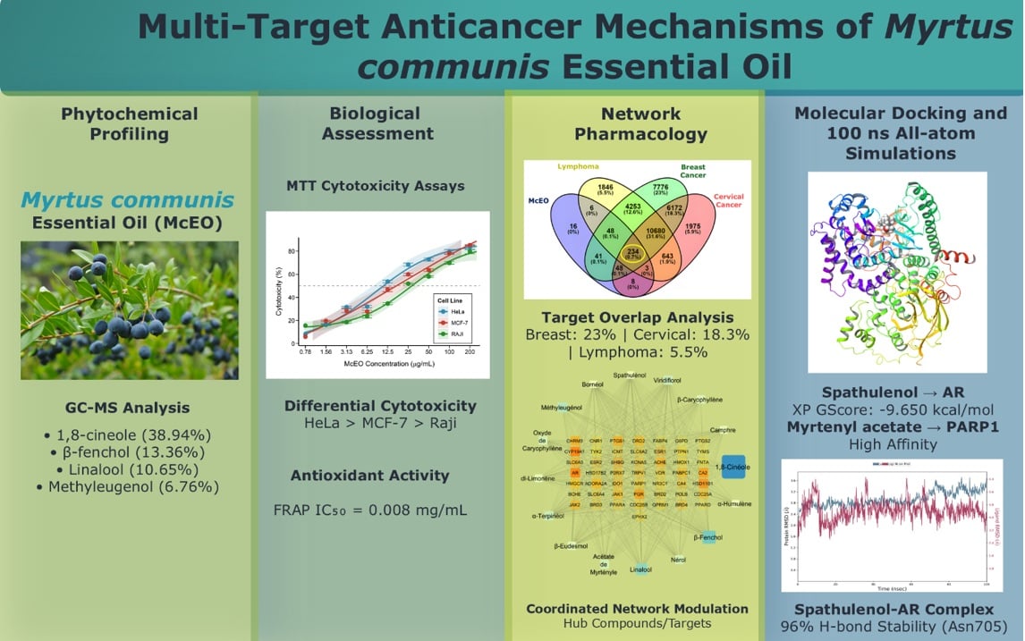 Integrated Network Pharmacology and Molecular Dynamics Reveal Multi-Target Anticancer Mechanisms of Myrtus communis Essential Oils