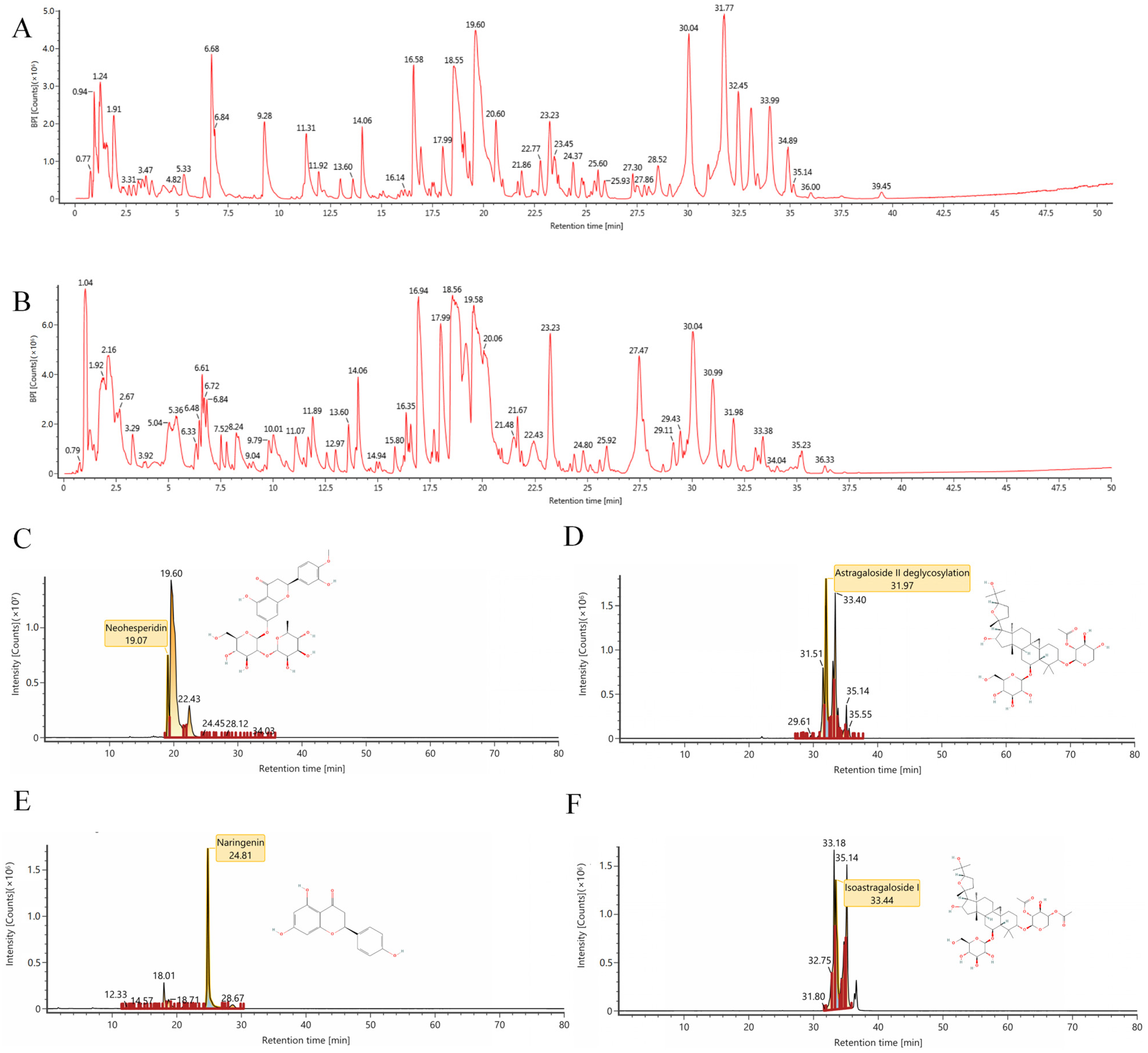 2.1. The Results of Ultra High-Performance Liquid Chromatography-Mass Spectrometry (UHPLC-MS/MS) Analysis