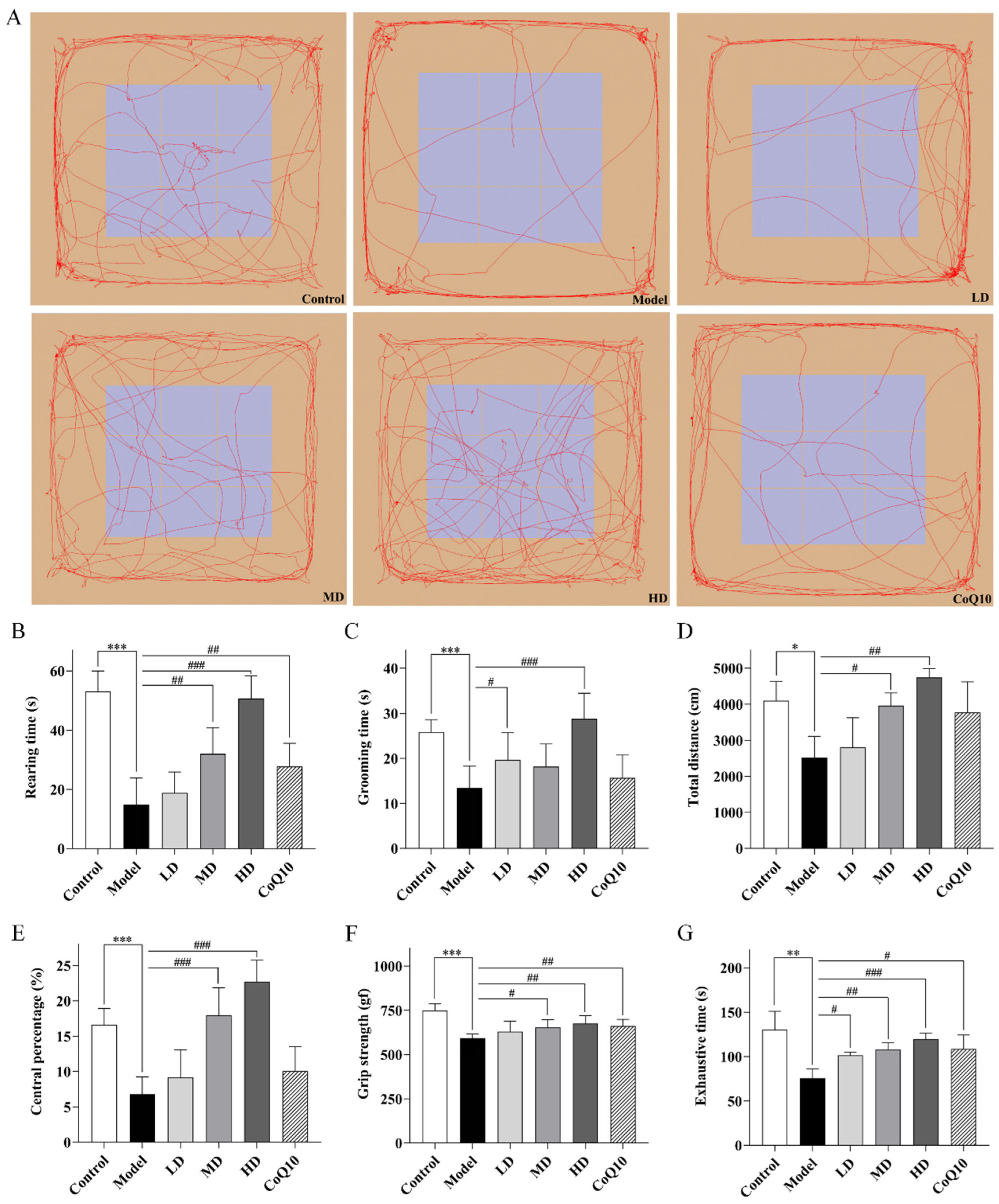 - Li, J.; Liu, Y.; Li, R.-T.; Liu, Y.; Li, F. The Effect of Anti-fatigue Decoction on the Behaviors and Serological Indicators in a Central Fatigue Rat Model. J. Vis. Exp. 2024, 206, e66481. [Google Scholar] [CrossRef]