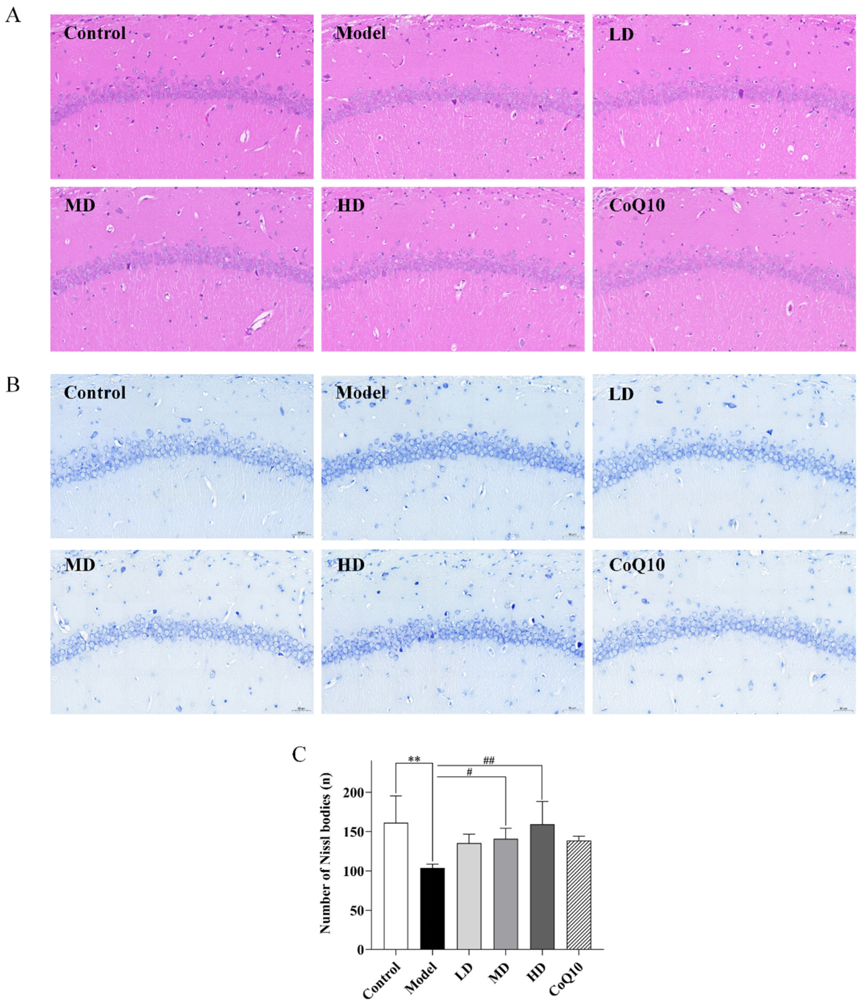 2.4. TFK Alleviates the Morphological Changes in the Hippocampal Tissues of Central Fatigue Rats