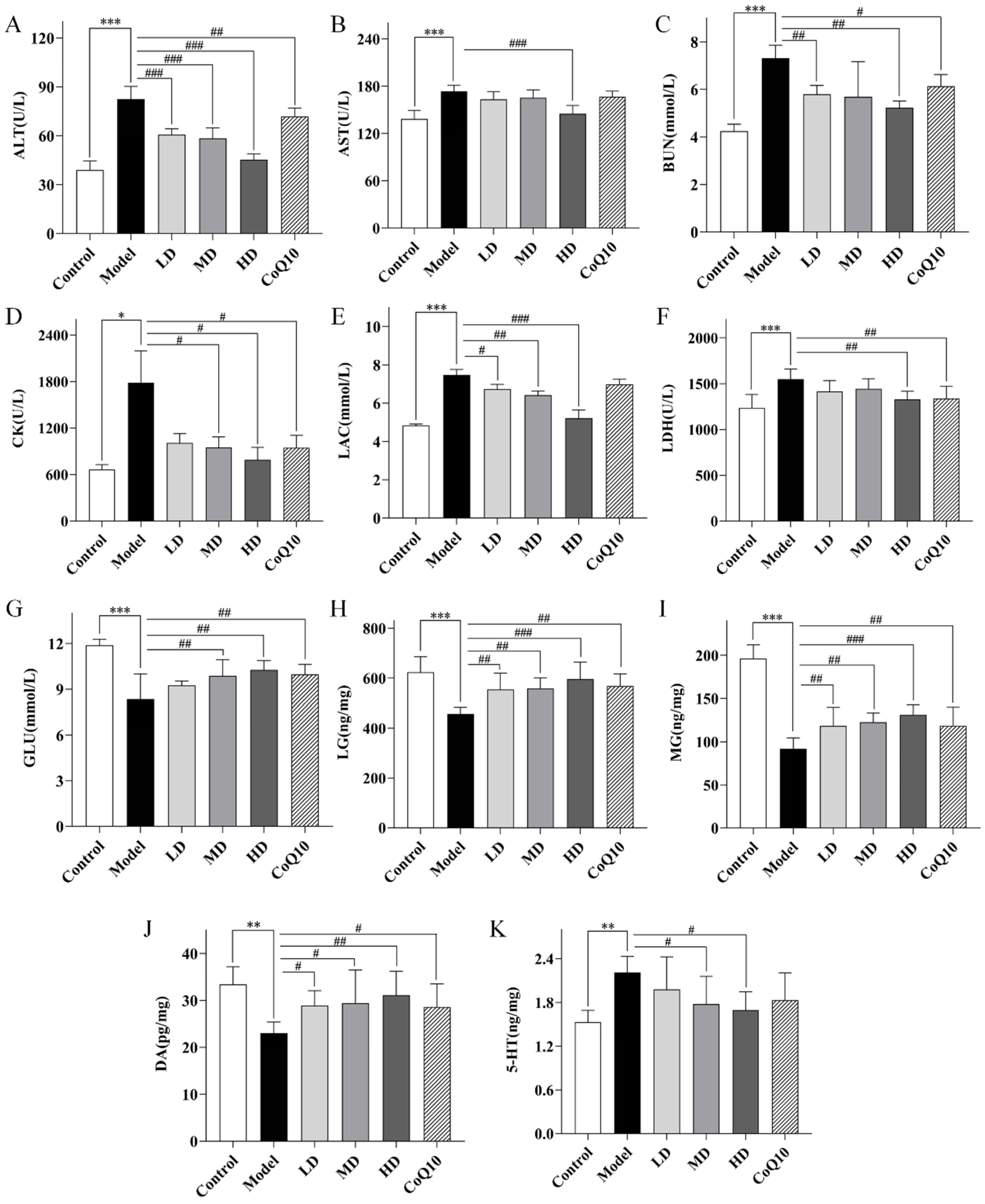 2.6. TFK Modulates Neurotransmitter Levels and Biochemical Metabolic Markers in Central Fatigue Rats