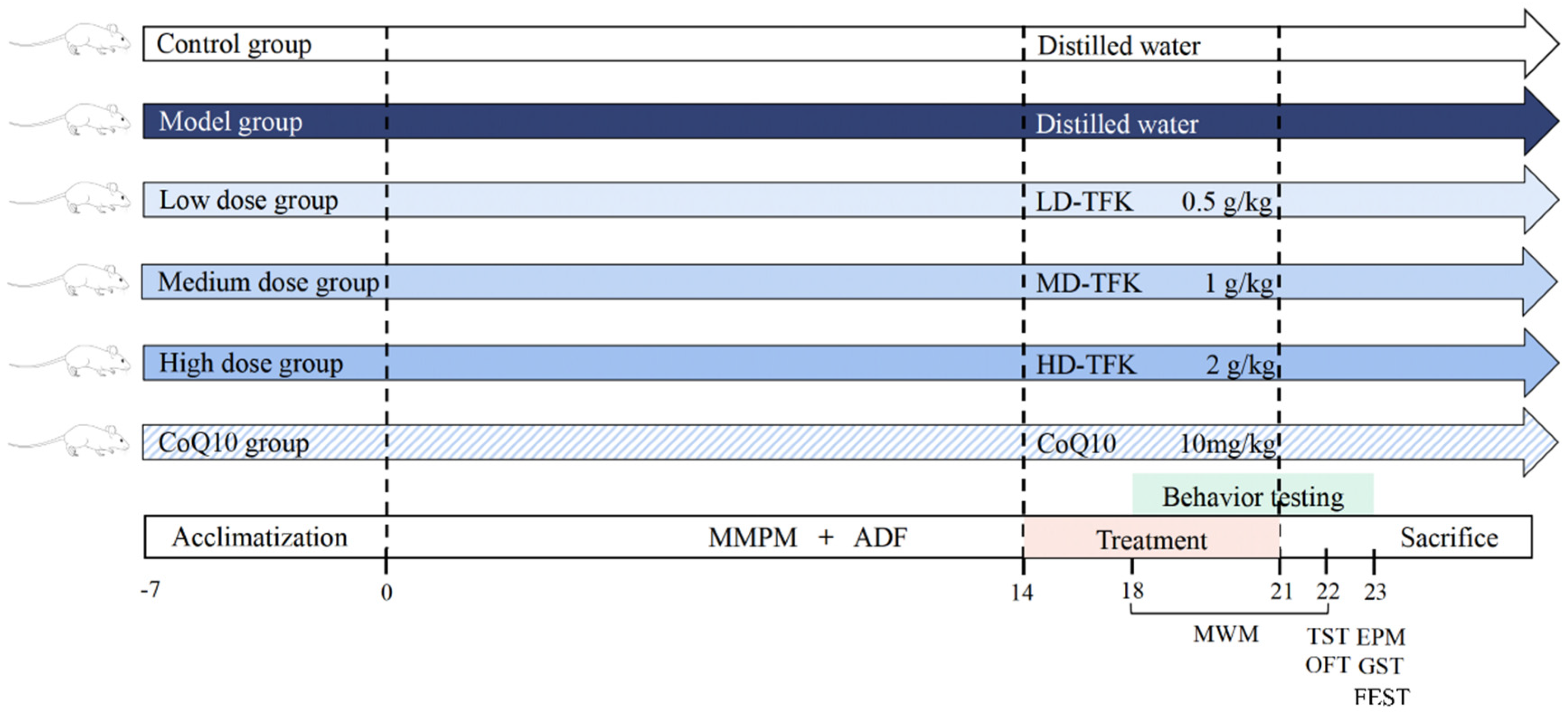 2.3. TFK Ameliorates Abnormal Behavioral Symptoms in Rats with Central Fatigue