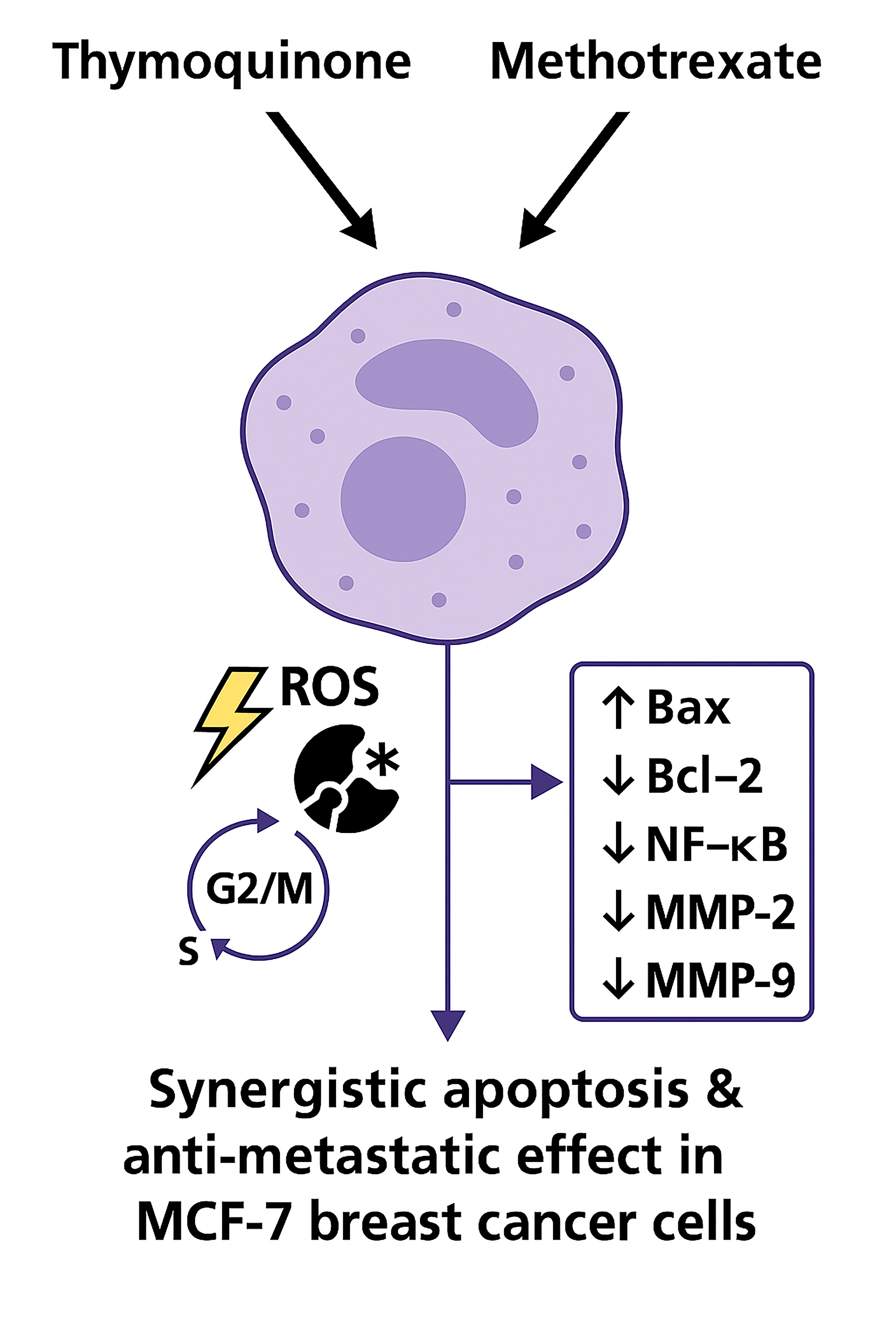 Therefore, the present study was designed to systematically investigate the combined effects of TQ and MTX in MCF-7 breast cancer cells, with particular emphasis on cell viability, apoptosis induction, oxidative stress, and the regulation of key molecular pathways. By elucidating the potential synergistic relationship between these agents, this study provides mechanistic insights into their mode of action. Furthermore, it highlights a promising therapeutic strategy that could enhance the efficacy of chemotherapy while reducing the toxicity associated with high-dose MTX treatment.