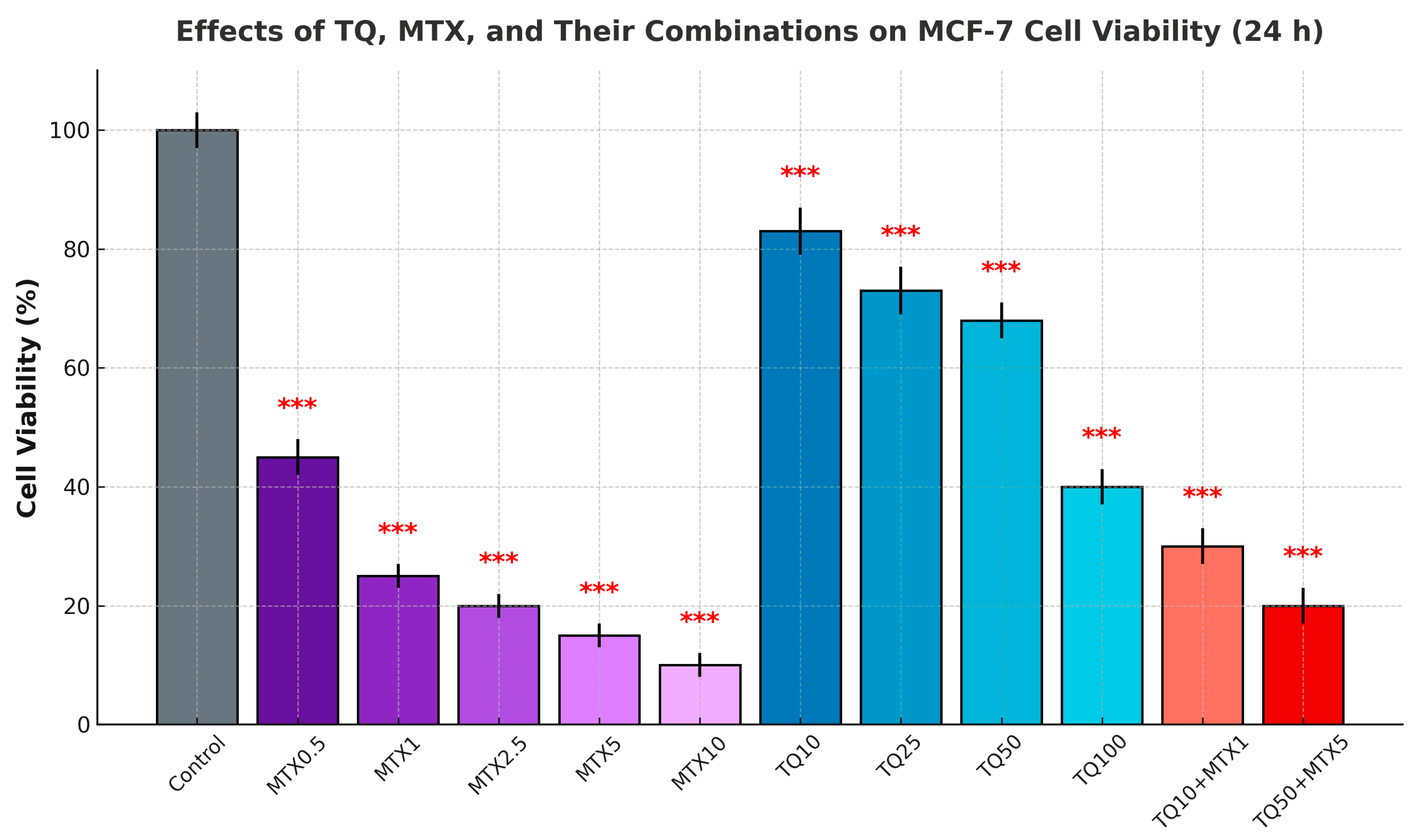 Therefore, the present study was designed to systematically investigate the combined effects of TQ and MTX in MCF-7 breast cancer cells, with particular emphasis on cell viability, apoptosis induction, oxidative stress, and the regulation of key molecular pathways. By elucidating the potential synergistic relationship between these agents, this study provides mechanistic insights into their mode of action. Furthermore, it highlights a promising therapeutic strategy that could enhance the efficacy of chemotherapy while reducing the toxicity associated with high-dose MTX treatment.