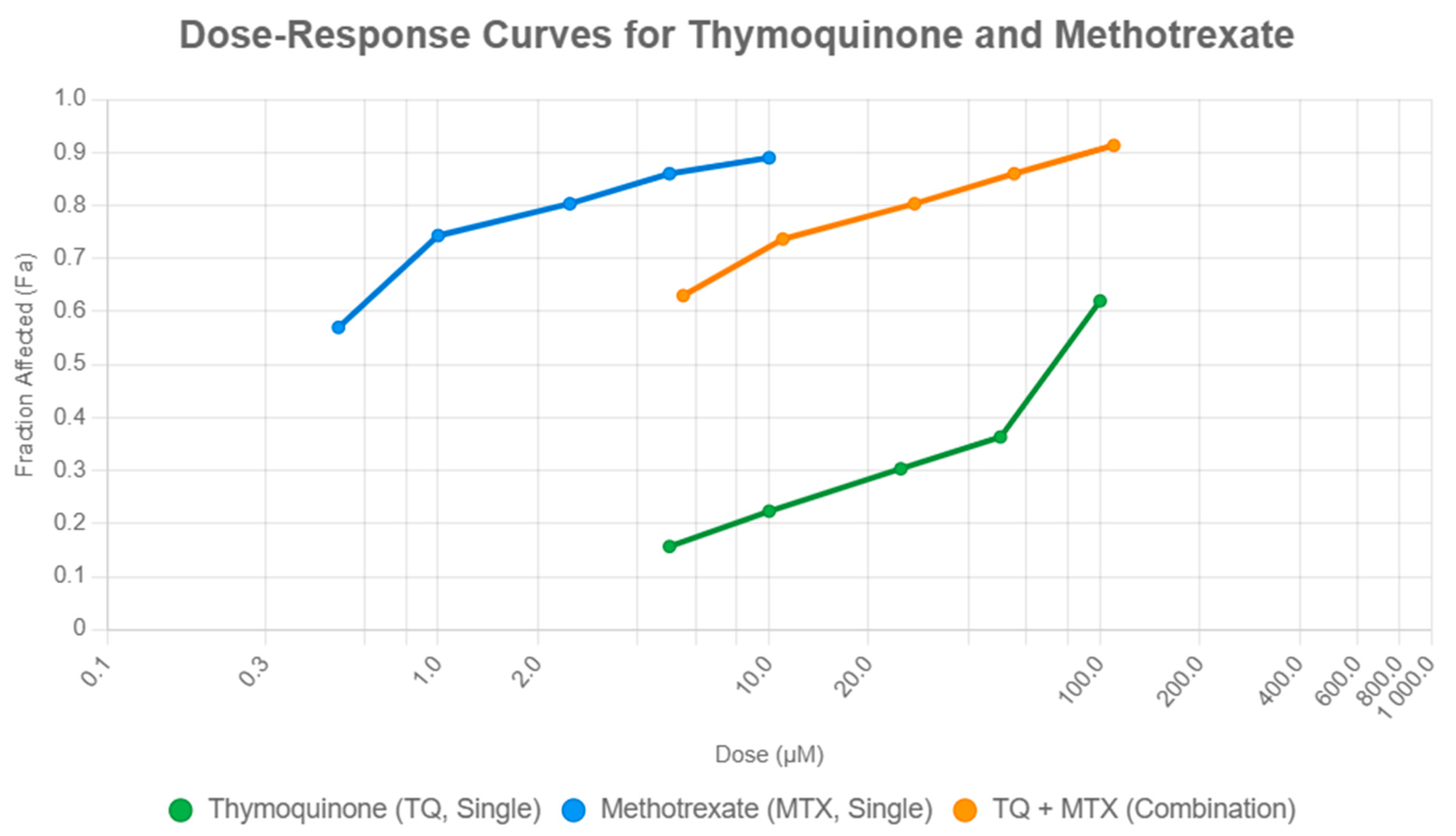The Chou–Talalay method was applied to evaluate the pharmacological interactions between TQ and MTX. Cell viability data obtained from the MTT assays were converted into fraction affected (Fa) values and analyzed using CompuSyn software (Version 1.0, ComboSyn Inc., Paramus, NJ, USA). CI values were calculated based on dose–effect curves for single agents and their combinations. CI < 1 indicated synergism, CI = 1 indicated an additive effect, and CI > 1 indicated antagonism. The analyses were performed using triplicate data sets, and the results were represented as Fa–CI plots and isobolograms generated by CompuSyn.