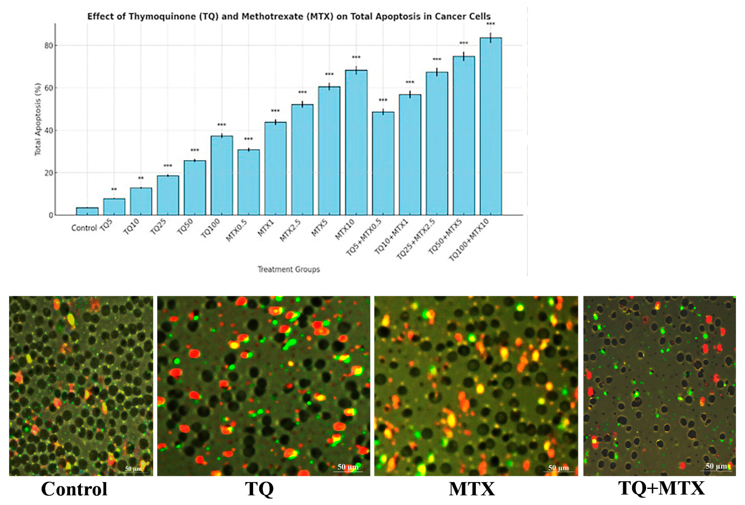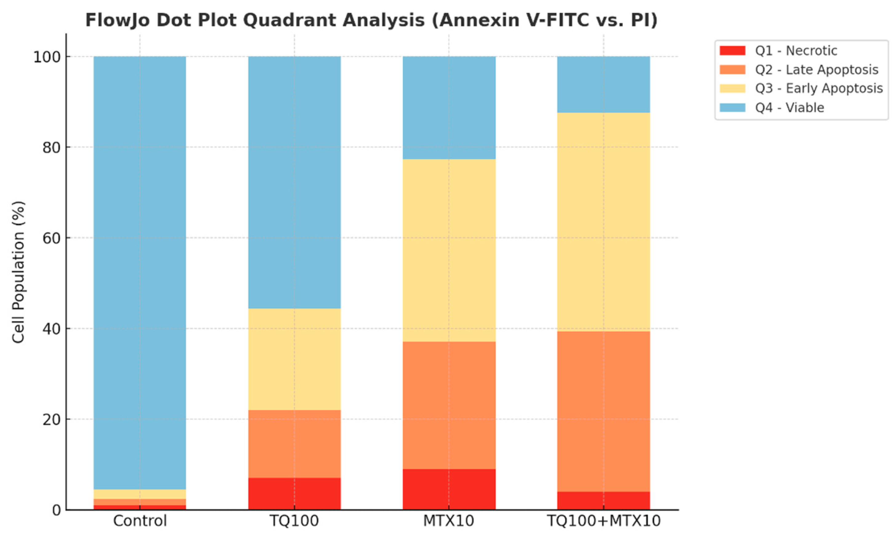 15]. Mechanistically, this synergy may arise from complementary actions: TQ activates the mitochondrial apoptosis pathway, while MTX intensifies cellular stress through inhibition of DNA synthesis and nucleotide metabolism. Recent evidence by Sanapour et al. demonstrated that combined treatment with TQ and MTX markedly enhanced apoptosis in osteosarcoma (Saos-2) cells by upregulating pro-apoptotic Bax and caspase-9 while downregulating anti-apoptotic Bcl-2 expression, leading to a significant increase in total apoptotic cell death (73%) compared with either agent alone (48% for TQ and 53% for MTX) [
