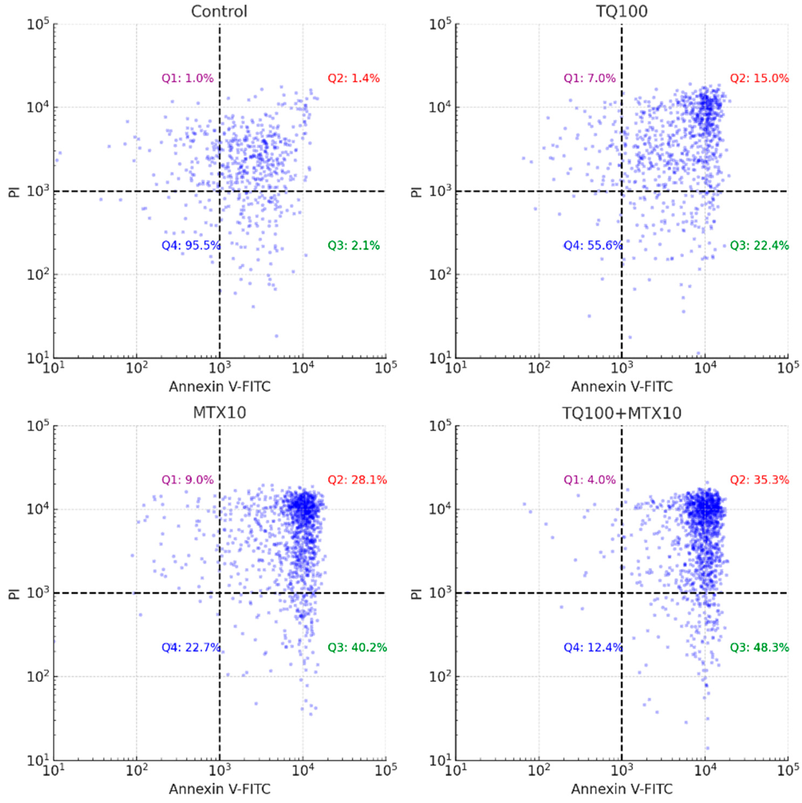 Annexin V/PI staining further validated the apoptotic response, revealing a dose-dependent induction of apoptosis in both single and combined treatments. Strikingly, in the TQ100 + MTX10 group, the total apoptosis rate reached 83.6%, with early apoptosis accounting for 48.3% and late apoptosis for 35.3%, far exceeding the rates observed with either agent alone [