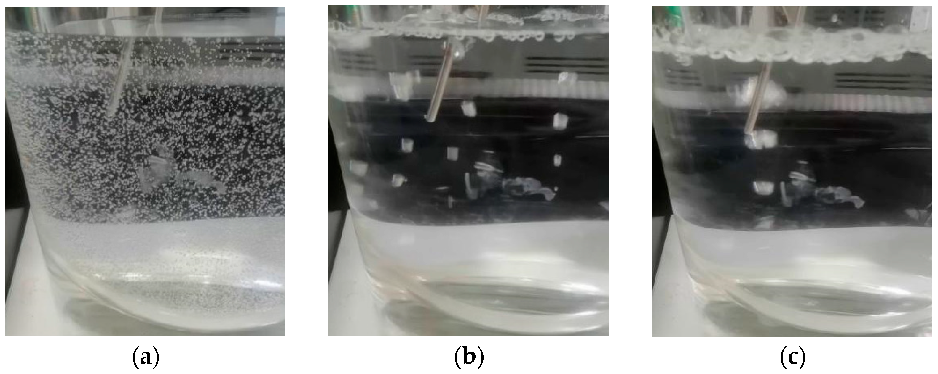 Figure 1a corresponds to the subcooled boiling stage. When the heating surface temperature approached the water saturated temperature, microbubbles formed slowly on the wall surface. No bubbles escaped from the water surface at this stage. As shown in Figure 1b, when the system entered saturated boiling, the bubbles detached from the wall surface, rose to the liquid surface, and eventually burst. This state, in which bubbles remained separated from each other, was referred to in this paper as “discrete saturated boiling”. When the boiling was more intense, the bubbles may merge with each other, as shown in Figure 1c. In this paper, this situation was referred to as “polymerized saturated boiling”.