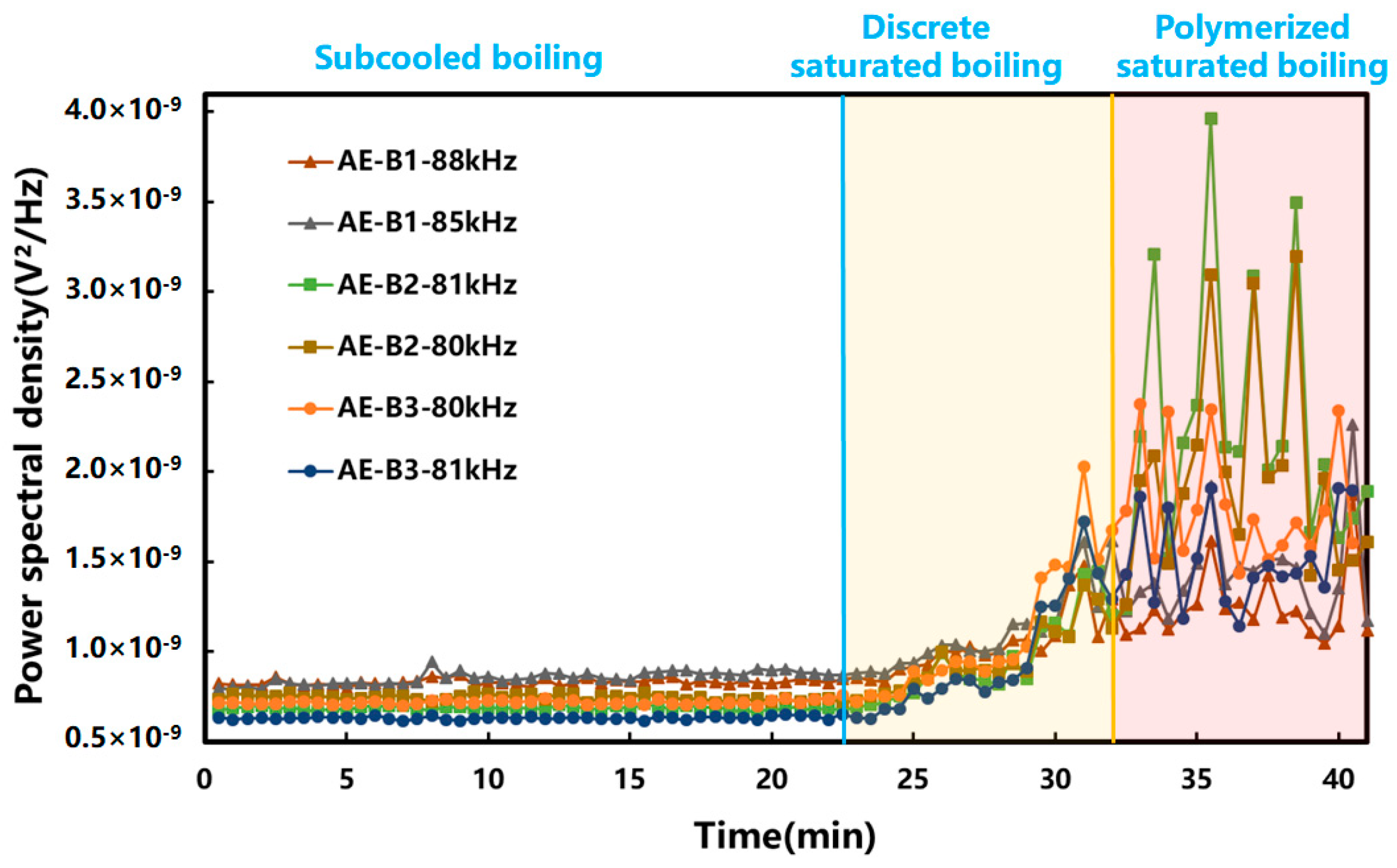 Observation of the spectrum in Figure 3 shows the presence of signal peaks in the 75–100 kHz band. In this study, the formation of microbubbles on the heating wall surface was taken as a sign that the system entered subcooled boiling. The rise of bubbles to the liquid surface after detaching from the wall surface was taken as a sign that the system entered discrete saturated boiling. The emergence of gas columns merging with each other was taken as a sign that the system entered polymerized saturated boiling. The boiling process was divided into three stages based on these indicators.