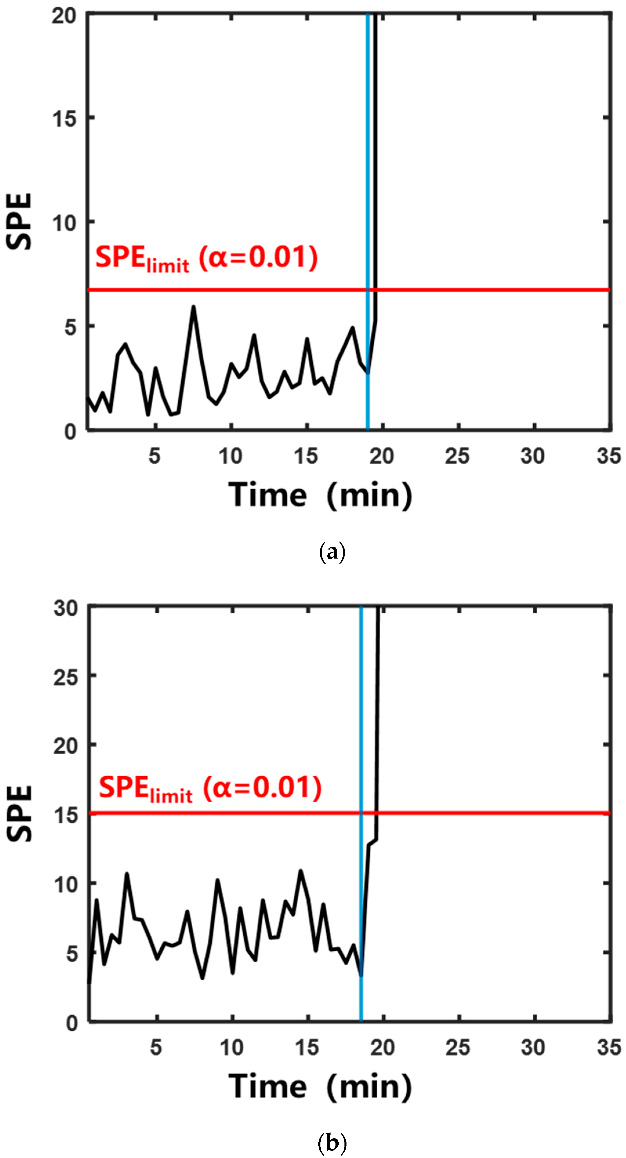 The SPE statistic is the sum of squares of the model residuals. It represents the variation in the sampling points not explained by the model. The SPE statistic for the n-th sampling point X n ( 1 × K ) is calculated as shown in Equation (7). It is used to measure the difference between the observed values and the predicted values of the PCA model.