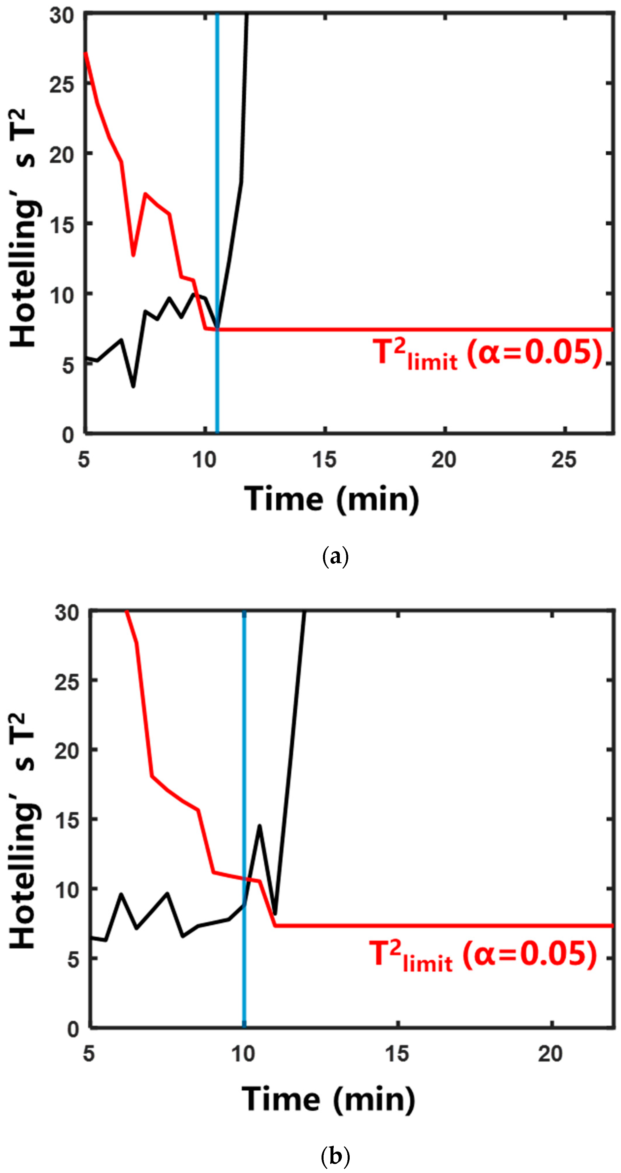 Machine-learning classifiers and neural networks typically require larger labeled datasets [41,42,43] and higher computational budgets [44,45,46]. In contrast, Hotelling’s T2 is efficient and lightweight. It is also easier to audit and maintain. With only a small number of nominal batches, it can establish models and control limits. However, compared with the commonly used method in the industry of determining boiling based on temperature, workers may feel the present method more difficult to understand.