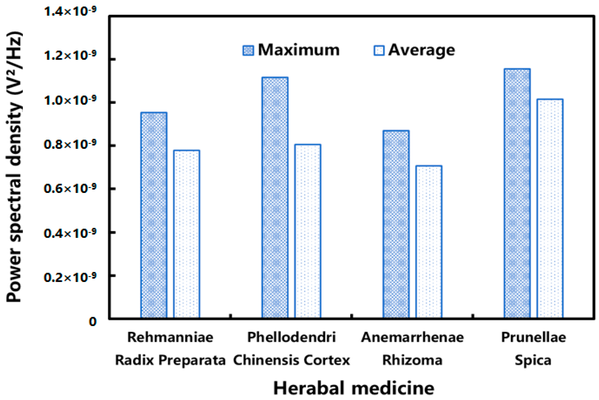 Figure 14. Maximum and average values of power spectral density at “signature frequencies” during the aqueous extraction of different herbs. (Both the axes and the color bars were linear. The power spectral density was presented in linear units (V2/Hz) and displayed in scientific notation.)