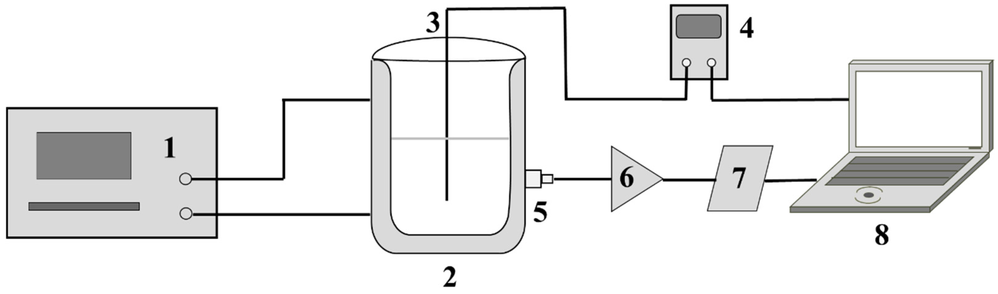 Figure 15. AE signal acquisition setup for herbal medicine extraction. (1) High-temperature circulator, (2) glass-jacketed reactor, (3) K-type thermocouple probe, (4) thermocouple temperature measuring instrument, (5) AE sensor, (6) AE signal conditioner, (7) data acquisition card, (8) workstation.