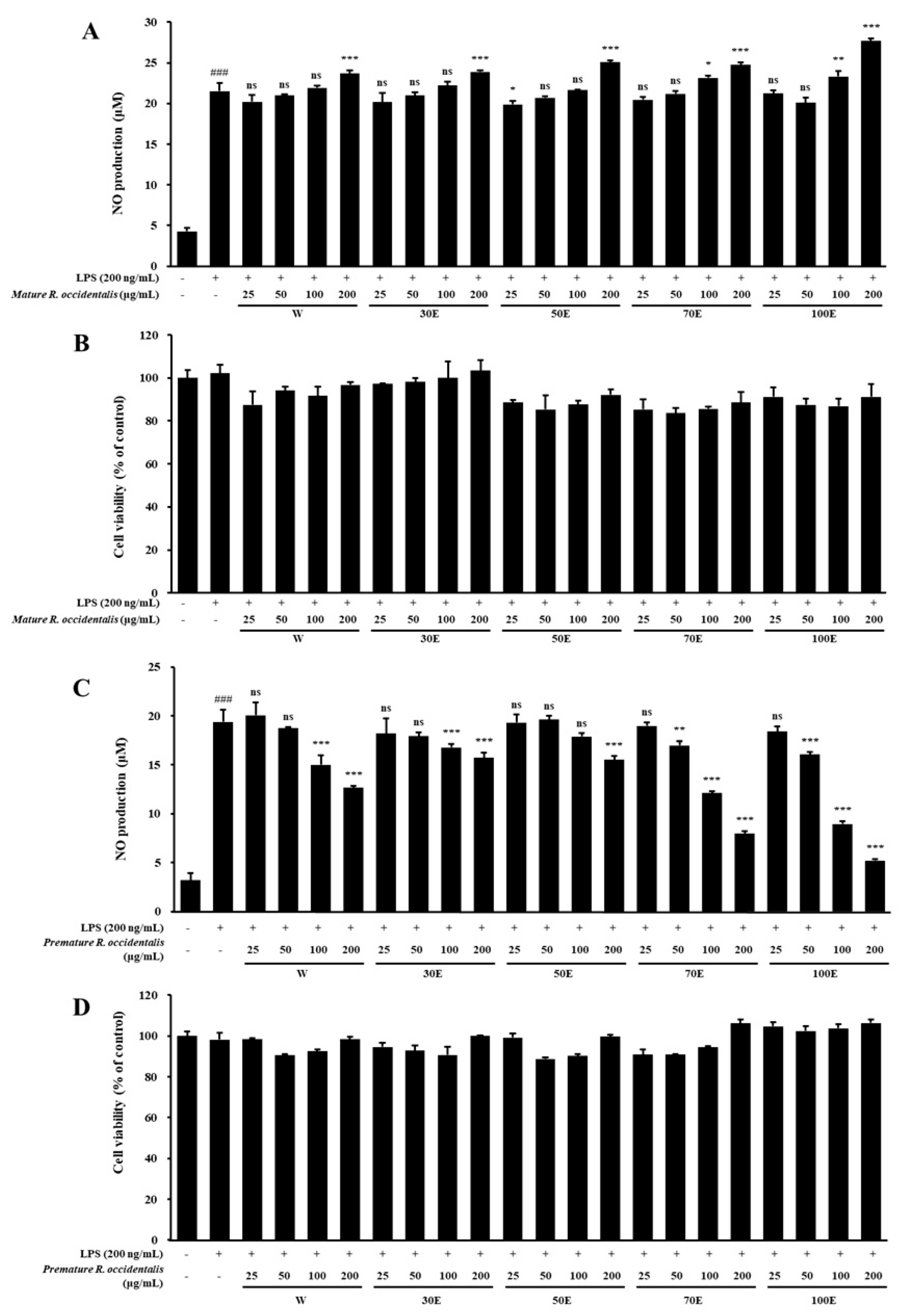 2.1. Inhibitory Effect of NO Production and Cell Viability of Mature and Premature R. occidentalis Extracts in LPS-Stimulated BV-2 Microglia Cells