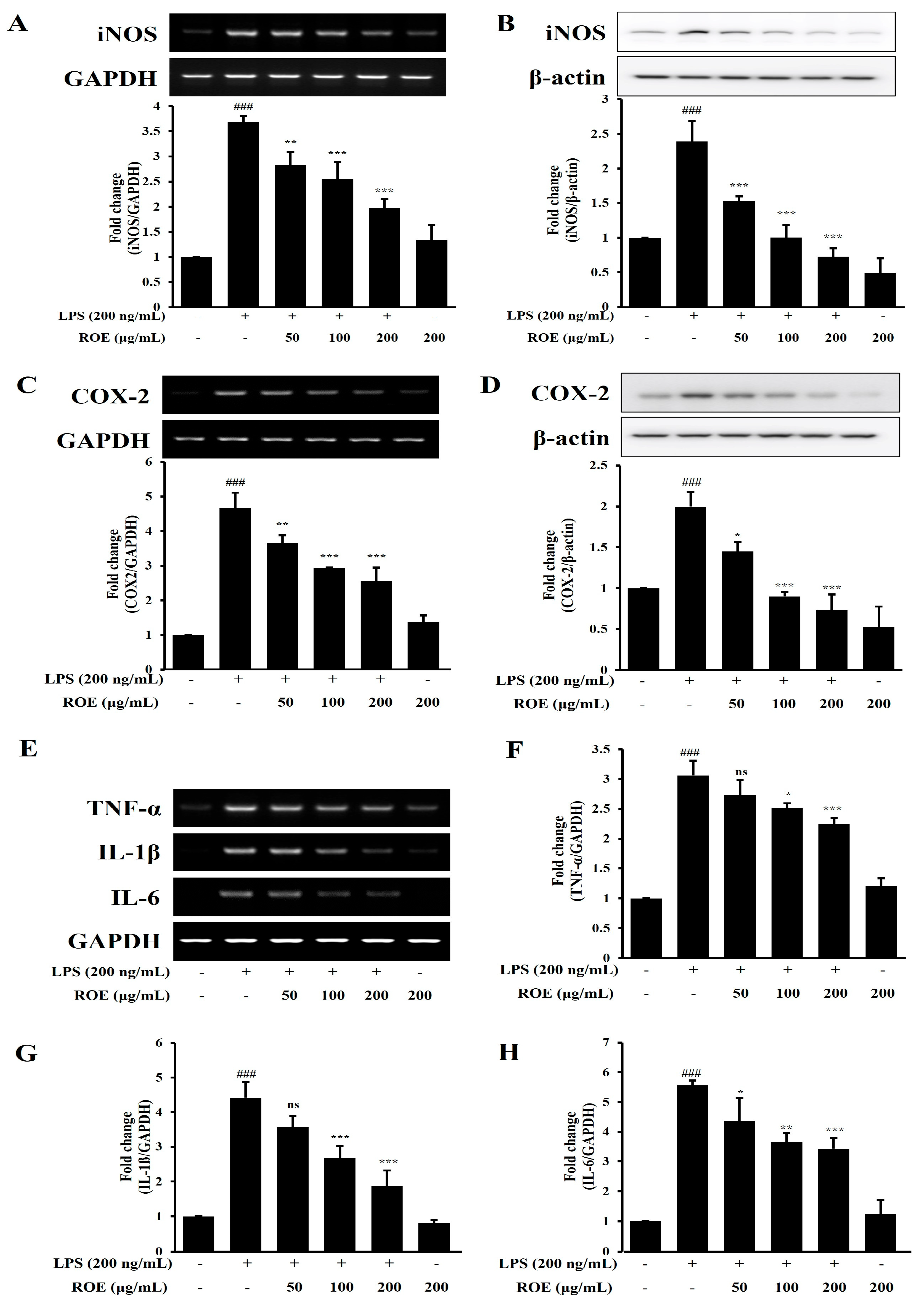2.3. ROE Inhibits mRNA and Protein Expression of iNOS, COX-2, and Pro-Inflammatory Cytokines in LPS-Stimulated BV-2 Microglia Cells