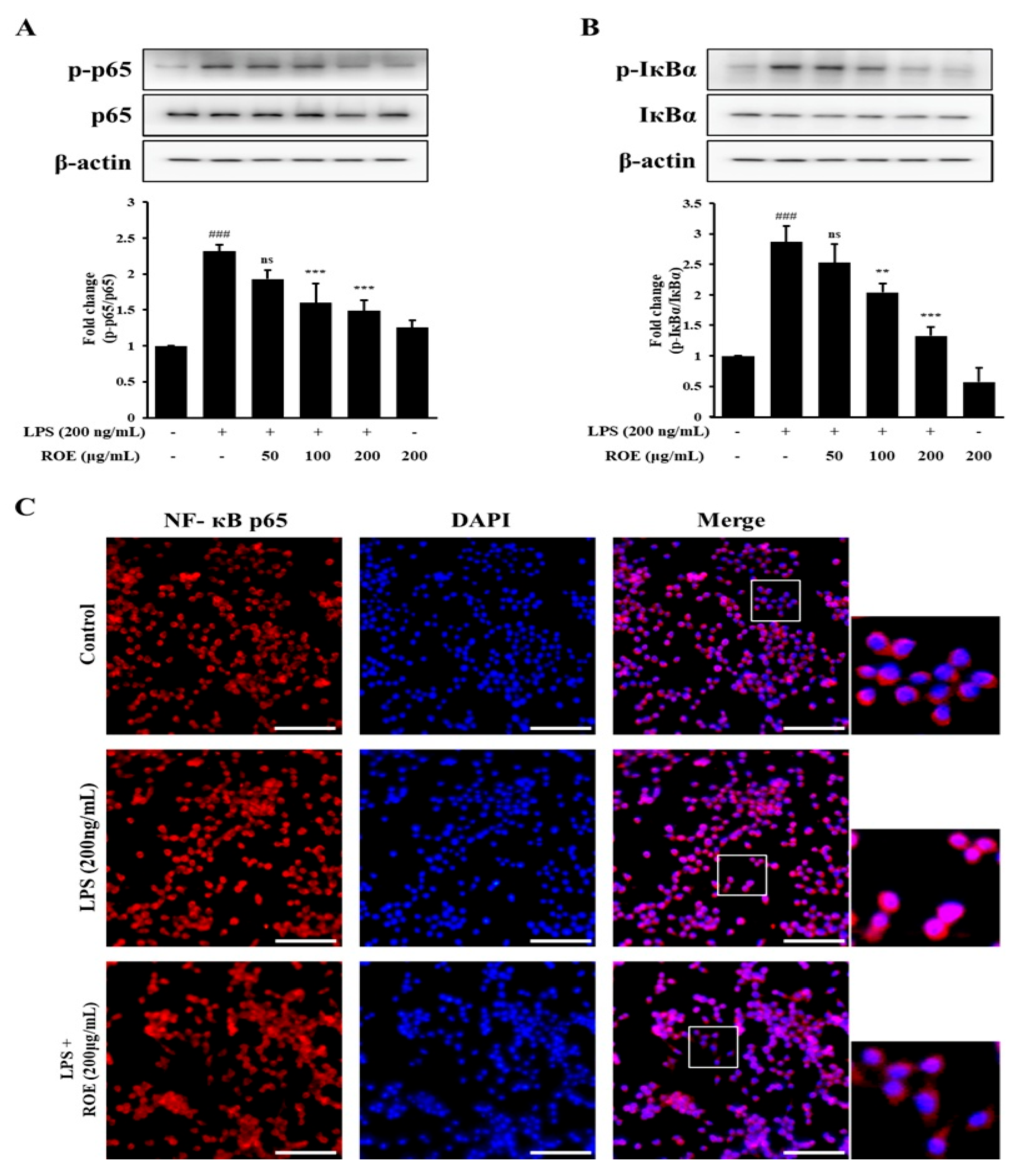 2.5. ROE Inhibited IκB-α Degradation and Nuclear Translocation of NF-κB in LPS-Stimulated BV-2 Microglia Cells