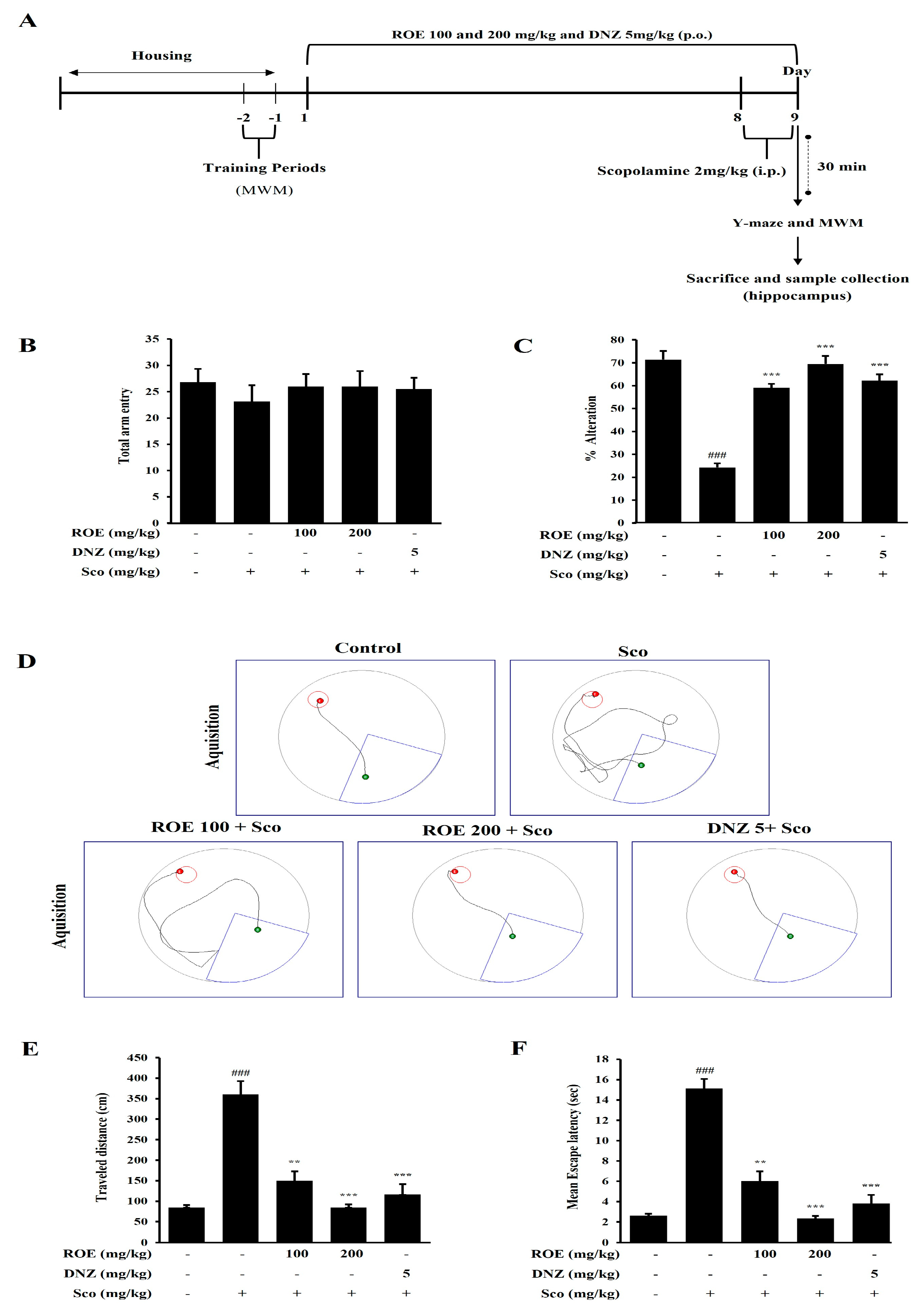 2.6. Effects of ROE on Spatial Learning and Cognitive Impairment in a Scopolamine-Treated Amnesic Mouse Model