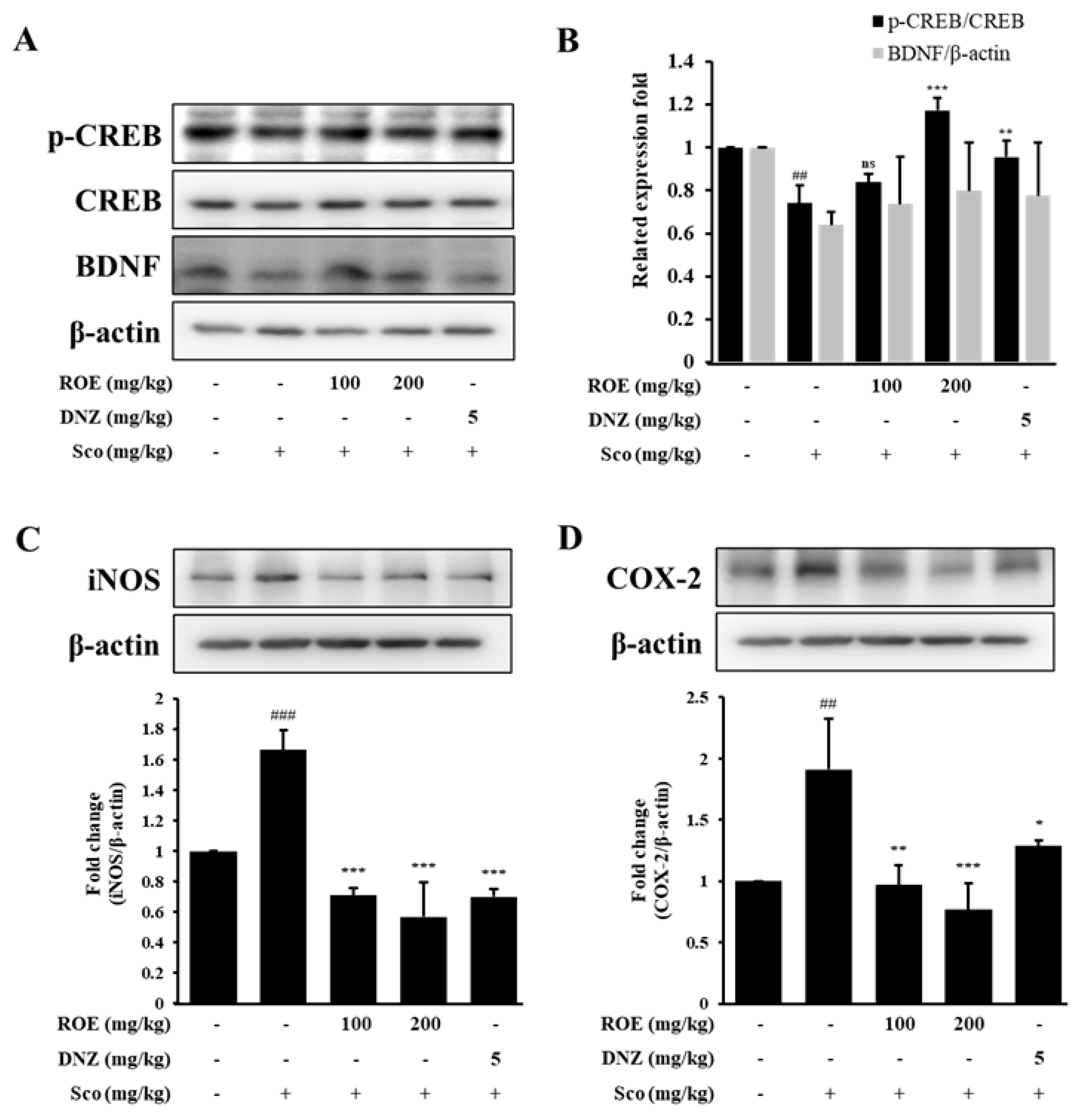 2.7. ROE Modulated BDNF/CREB Signaling and Inflammatory Mediator Expression in the Hippocampus of Scopolamine-Treated Amnesic Mice