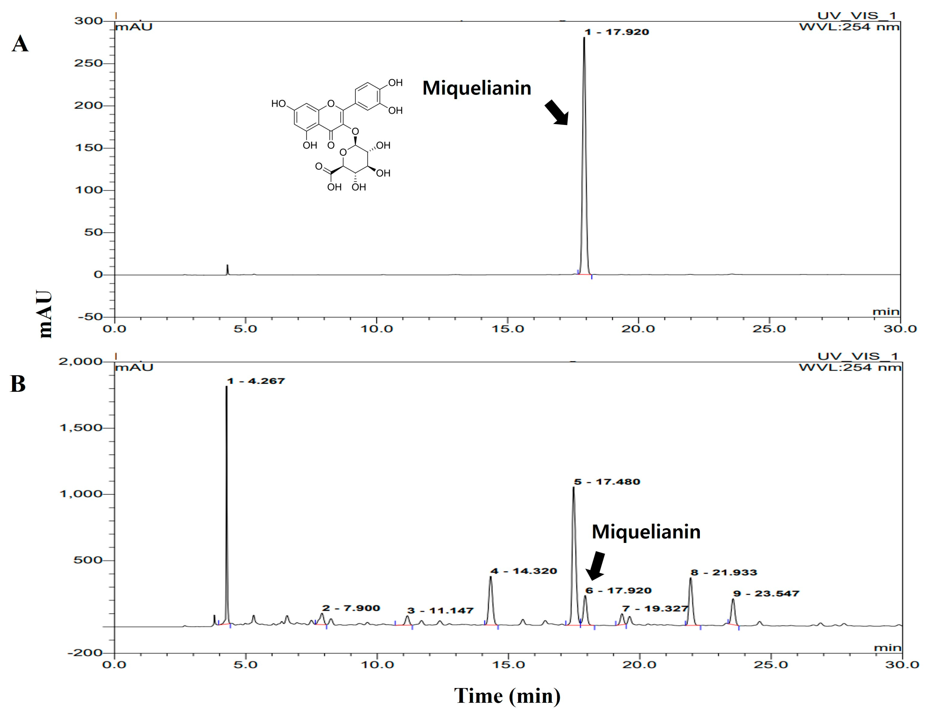 2.8. Analysis of Miquelianin Using High-Performance Liquid Chromatography