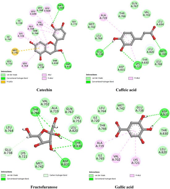 | Best docked compounds | Catechin | −7.56 | Met769 (3.22), Asp831 (2.55) | Leu820, Leu694, Val702 (2), Ala719 (3), Lys721 (2), Leu764 | |