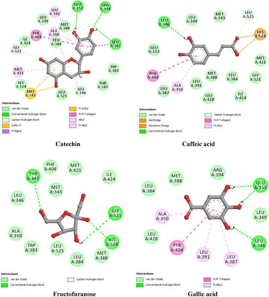 | Gallic acid | −6.04 | Glu353 (2.51), Glu353 (2.58), Leu346 (3.36) | Ala350, Phe404, Leu391, Leu387 | ||