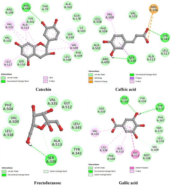| Gallic acid | −6.33 | Ser516 (2.49), Tyr371 (2.62), Val509 (2.72) | Val335, Leu338, Ala513, Gly512 | ||
