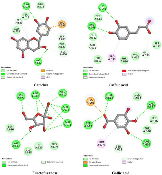 | Gallic acid | −6.75 | Ser611 (2.44), Ser611 (3.12), Ser613 (2.74), Glu612 (2.52), Arg609 (3.45), Val637 (2.35) | Pro639 | ||