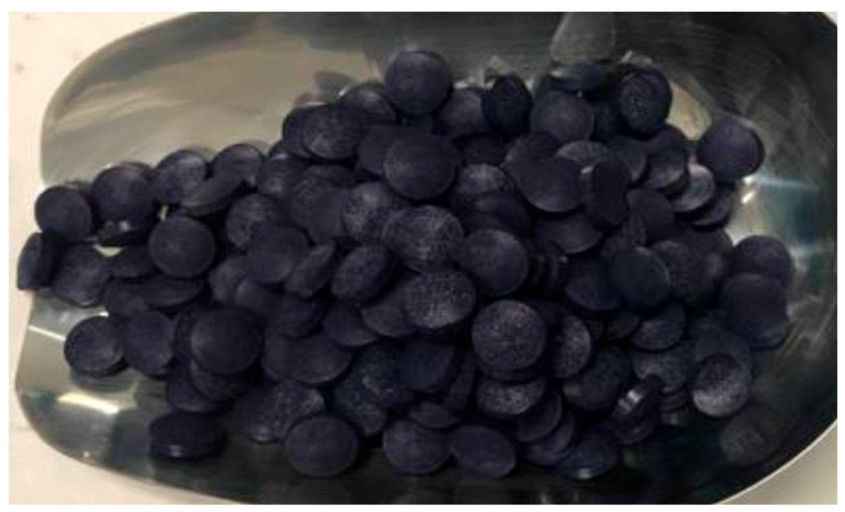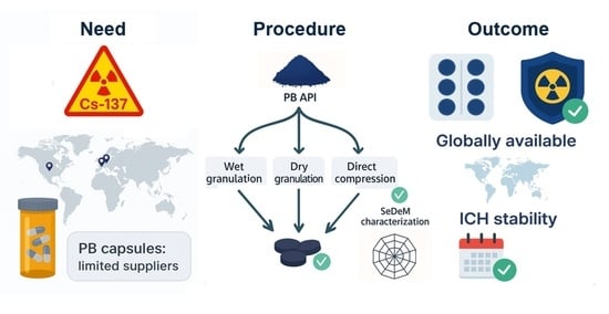 ® is publicly disclosed in the SmPC (whereas quantitative composition and process details are not), the AZPINDECS project was initiated by the Spanish Ministry of Defense. Within this framework, a strategic decision was made to develop a military-grade CBRN countermeasure in the form of tablets containing 500 mg of PB as the active pharmaceutical ingredient (API). A tablet formulation is particularly advantageous in emergency scenarios: direct compression offers shorter production cycles and higher yields than capsule production, with fewer processing stages and facility requirements. The PB used in this study for tablet development was locally synthesized at the University of Alcalá; additionally, the physicochemical and pharmacotechnical characterization of this PB, as well as its Cs-binding capacity, was detailed in the publication “Physicochemical and pharmacotechnical characterization of PB for future PB oral dosage forms formulation” [