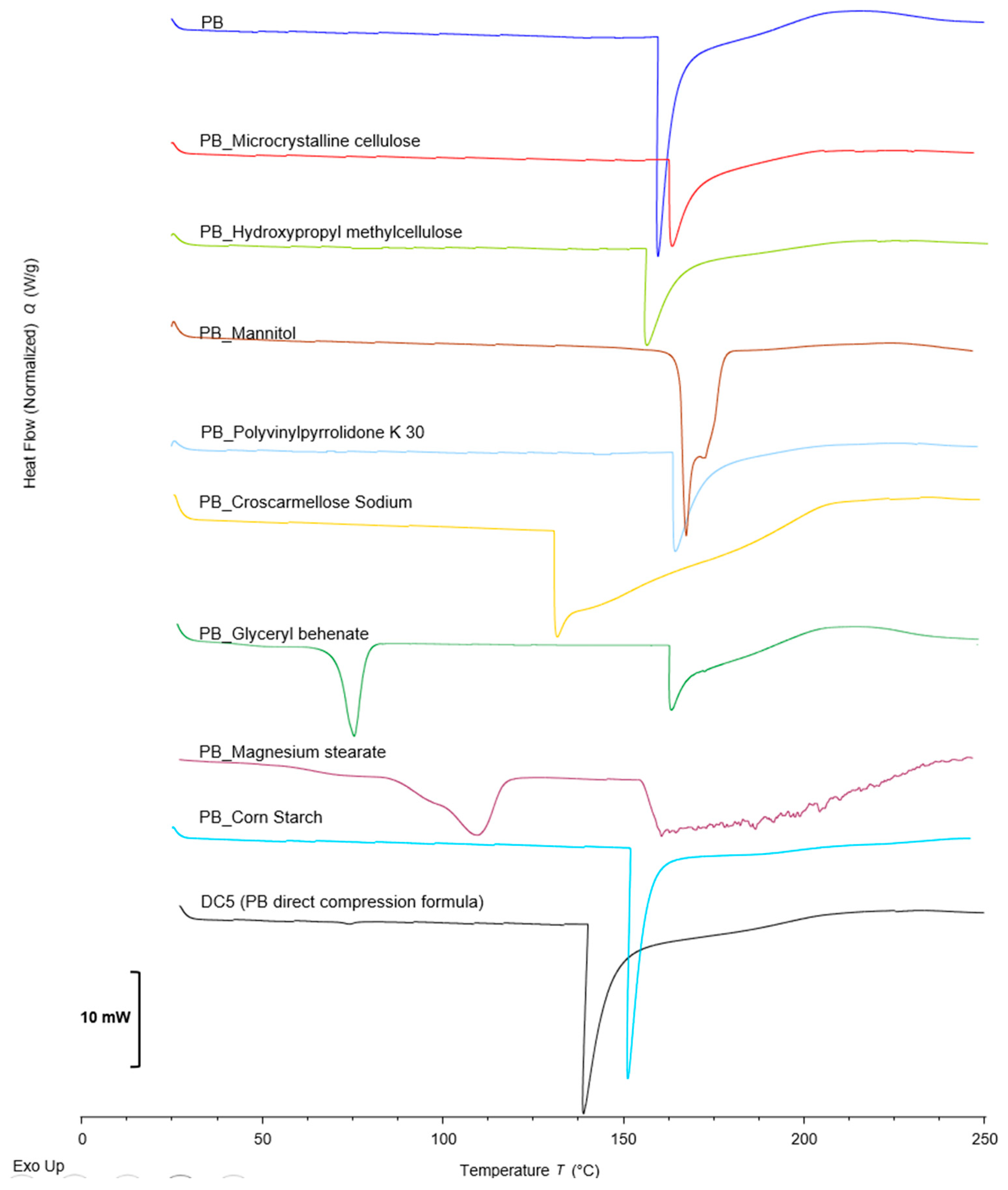 Figure 2 shows the thermograms of the raw PB material and all binary PB-excipient combinations that were obtained. For completeness, DSC thermograms of the individual components (PB and each excipient) were also acquired under identical conditions; the corresponding reference profiles are provided in the