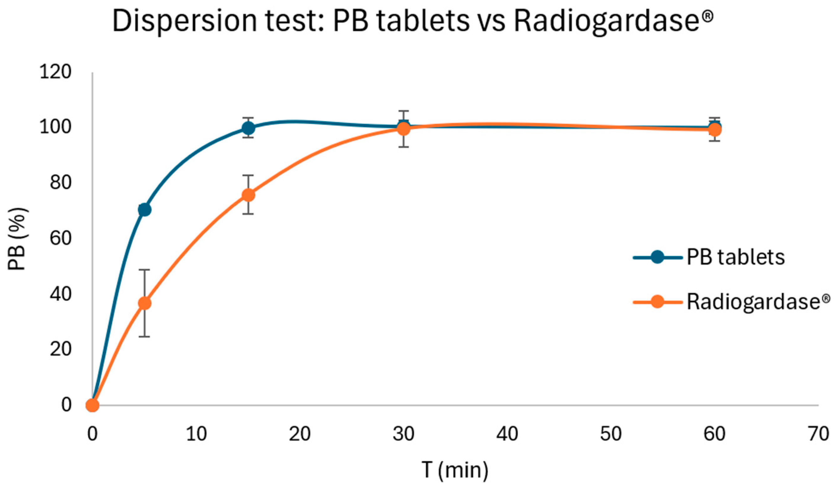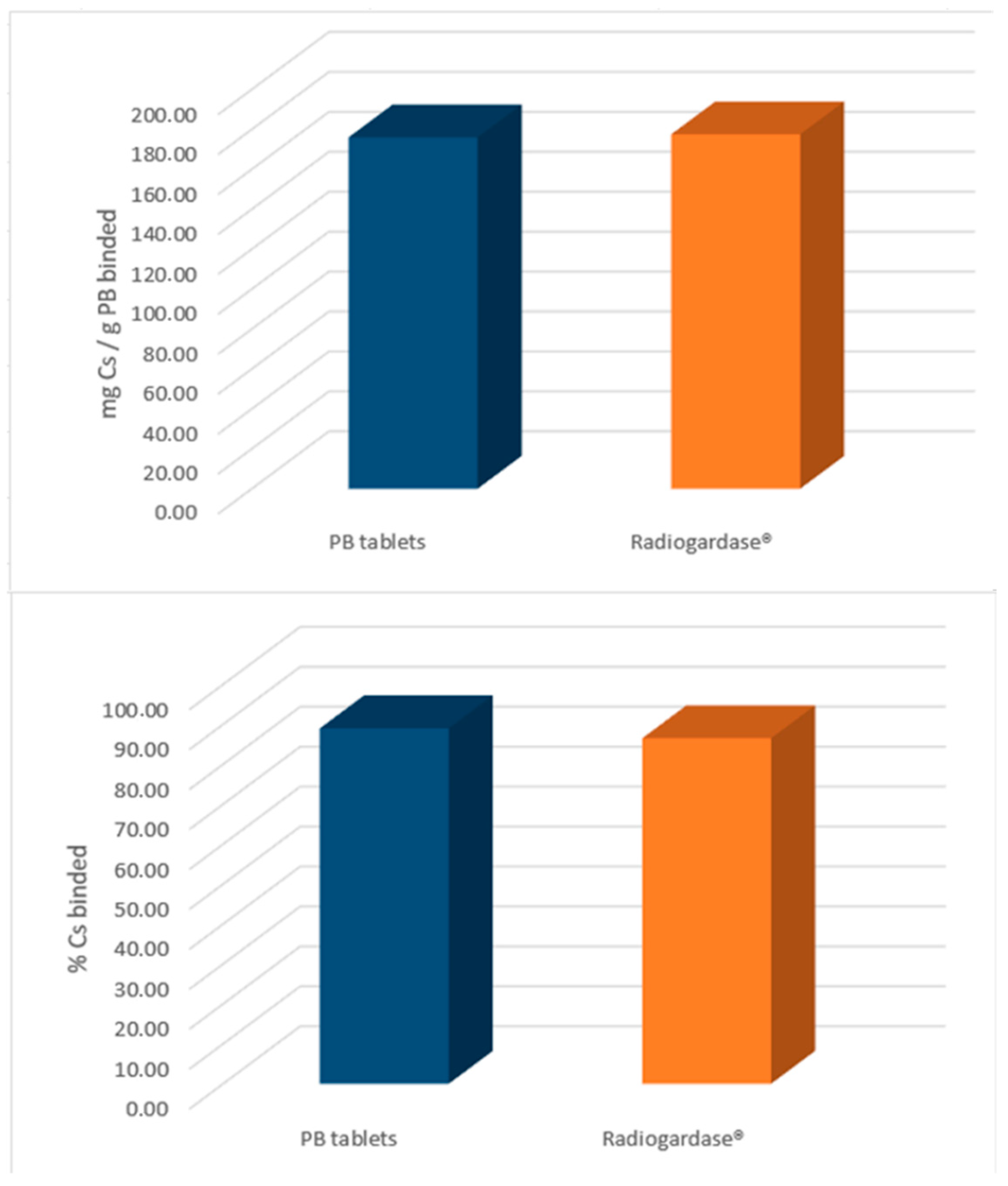 To determine the Cs-binding capacity of the PB tablets, an in vitro procedure was used. For the test, one PB tablet was added to 100 mL of phosphate buffer (40 mM, pH 7.5) containing 100 ppm Cs; the suspension was agitated for 24 h at 37 °C. After agitation, the suspension was filtered, and the unbound Cs was measured using inductively couple plasma-optical emission spectroscopy (ICP-OES, Varian 720 instrument, Varian Inc., Palo Alto, CA, EE. UU.). As a reference, the same procedure was carried out with one Radiogardase® capsule, the marketed medicinal product containing PB as the active ingredient. The ICP-OES operating conditions were as follows: