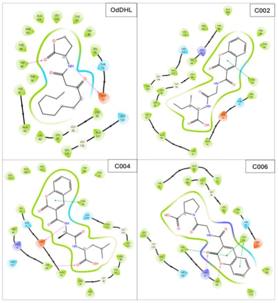 A molecular docking study was performed on the designed molecules to identify potential competitive inhibitors of the LasR protein. The results revealed that eleven compounds presented higher negative binding energies than did OdDHL, the natural autoinducer. Among these, six compounds (C002, C004, C006, F007, F008, and P004) surpassed the ΔG of the autoinducer by more than −0.6 kcal/mol. All the designed molecules fell within the small-molecule range (MW < 500 g/mol), consistent with the autoinducer, and were categorized as peptide or peptide conjugate molecules [36]. The coumarin conjugated peptides C004 and C006 presented the highest negative binding energies, with ΔG values of −10.35 kcal/mol and −9.73 kcal/mol, respectively. However, the average binding energy values of the furanone-conjugated peptides (−8.51 kcal/mol) were greater than those of the coumarin-conjugated peptides (−7.91 kcal/mol). In contrast, tripeptides generally exhibited lowest binding energies (average ΔG = −6.49 kcal/mol), except for P004, which had a notable ΔG of −9.19 kcal/mol (Table 1).