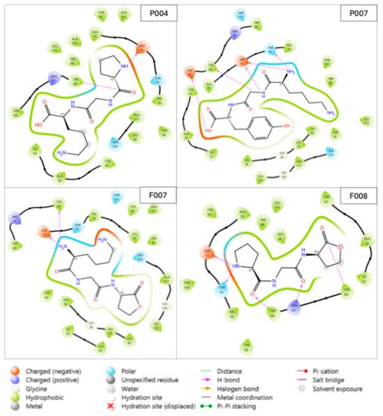 As illustrated in Table 4, the physicochemical properties of the selected ligands were assessed based on molecular weight (MW), topological polar surface area (TPSA), and ClogP. All ligands had MW values below 500 Da, aligning with Lipinski’s rule of five for drug-likeness. However, the TPSA of P007 exceeded 140 Å2, which is predicted to negatively impact its oral bioavailability due to reduced permeability and absorption. Moreover, the ClogP values for F007, F008, P004, and P007 were below 0, falling outside the optimal range for oral bioavailability. These deviations suggest that these compounds may face challenges in achieving adequate absorption and distribution when administered orally.
