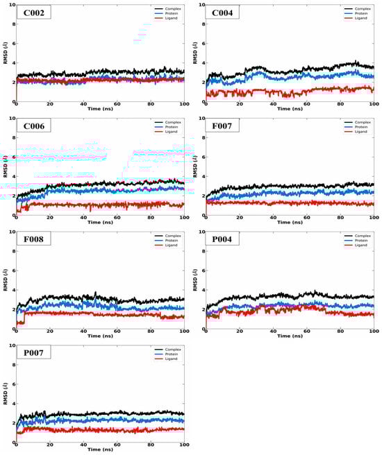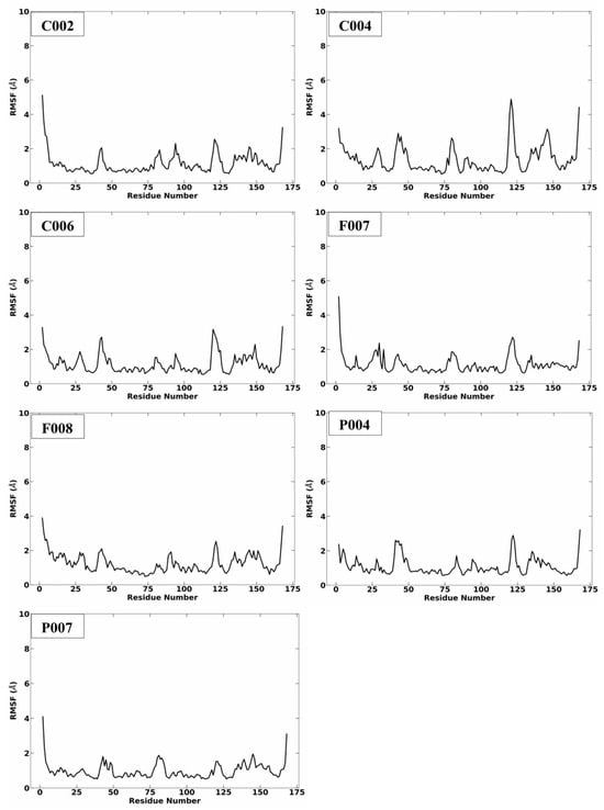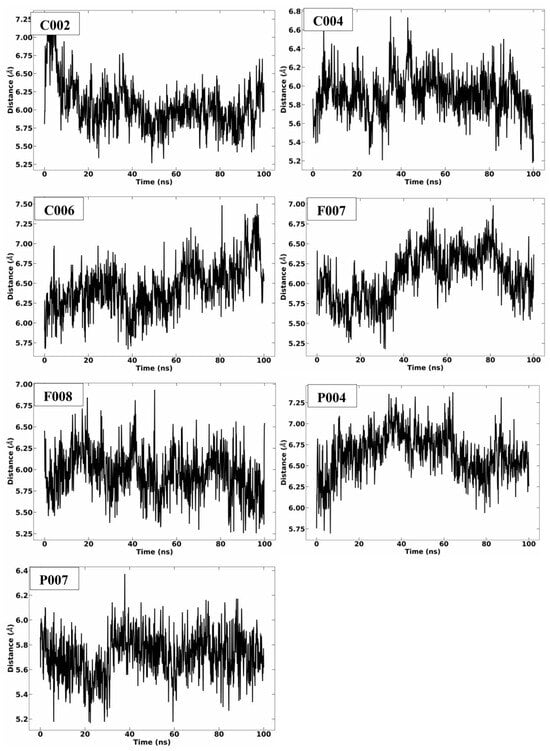 The center of mass (COM) distance, a key parameter in molecular dynamics (MD) simulations, measures the distance between the mass centers of the protein and ligand, providing insights into binding stability and conformational changes. A stable COM distance suggests consistent ligand binding, while fluctuations or increases indicate potential dissociation or movement. Conversely, a decrease may signify ligand rebinding. In this study, protein–ligand interactions were stable, with COM distances between 5 and 7.5 Å because compounds C006, F007, and P004 were averaged approximately 6.5 Å; compounds C002, C004, and F008 averaged 6 Å, while P007 averaged 5.8 Å (Figure 9). Combining COM analysis with RMSD and RMSF can enhance understanding of complex dynamics and stability [56,57].