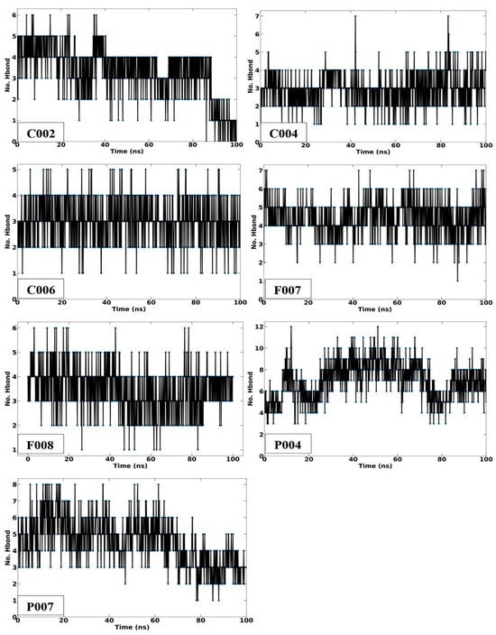 Hydrogen bond analysis involves calculating and visualizing these interactions based on specific geometric criteria, including the angle and distance between the hydrogen, donor, and acceptor atoms. Typically, -OH and -NH groups are considered hydrogen donors, while -O and -N groups act as acceptors by default [51]. The hydrogen bond interactions observed between the designed ligands and the LasR protein during the MD simulations are illustrated in Figure 6. The analysis revealed that the average number of hydrogen bonds formed with the LasR protein was three for compounds C002, C004, and C006. Compounds F007 and F008 demonstrated higher levels of interaction, with averages of five and four hydrogen bonds, respectively. In contrast, P004 lacked stable hydrogen bonds, while P007 showed an average of four hydrogen bonds during the simulation (Figure 6).