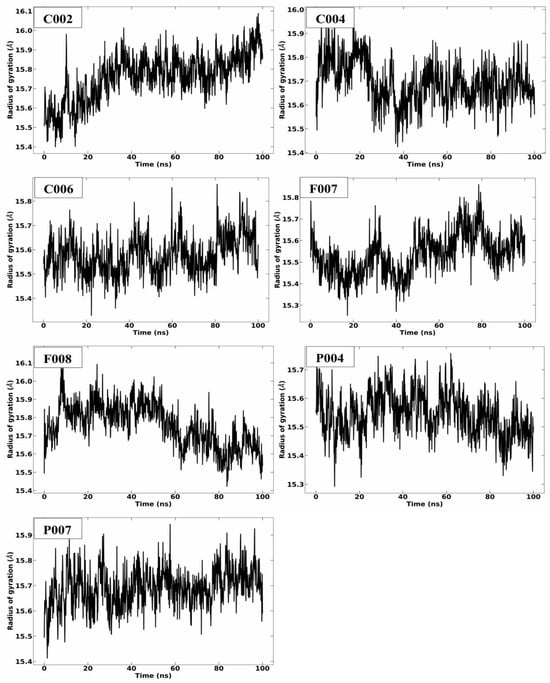 The Rg quantifies the compactness and folding state of proteins, offering valuable information about the dynamics of macromolecules and the distribution of their mass centers. Typically, larger proteins show higher Rg values [52]. Protein-ligand complexes often display greater Rg values compared to the unbound state. The normal range for Rg lies between 10 and 50 Å. During molecular dynamics simulations, Rg stabilizes into a plateau upon system equilibration; however, significant fluctuations in Rg may indicate conformational changes or protein unfolding [53]. In this study, as depicted in Figure 7, the Rg values for all protein–ligand complexes ranged between 15 and 16 Å, falling within the normal range. This indicates that the protein retained its structural integrity and compaction throughout the simulation. Moreover, the observed Rg values were consistent with those of the co-crystal ligand, suggesting similar compaction and stable dynamics during the simulation (Figure 7).