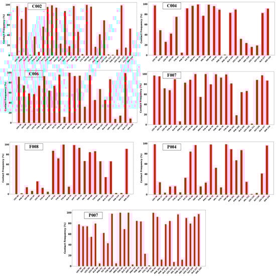 CF analysis is an MD simulation analysis used to assess the frequency of atomic or residue-level interactions between a ligand and a protein. This approach quantifies the stability and strength of these interactions over time by observing specific distances, often within 3.5–5 Å (for non-covalent interactions), between two atoms based on trajectory files. CF analysis can be implemented to identify key receptor residues crucial for ligand binding and evaluating the overall interaction stability throughout the simulation period [54]. Binding interactions observed in MD simulations are typically considered reliable when their contact frequency exceeds 50%. Interactions with contact frequencies of 80% or higher are particularly significant, as they indicate strong and stable binding between the ligand and protein, which is crucial for maintaining the overall stability of the complex [55].