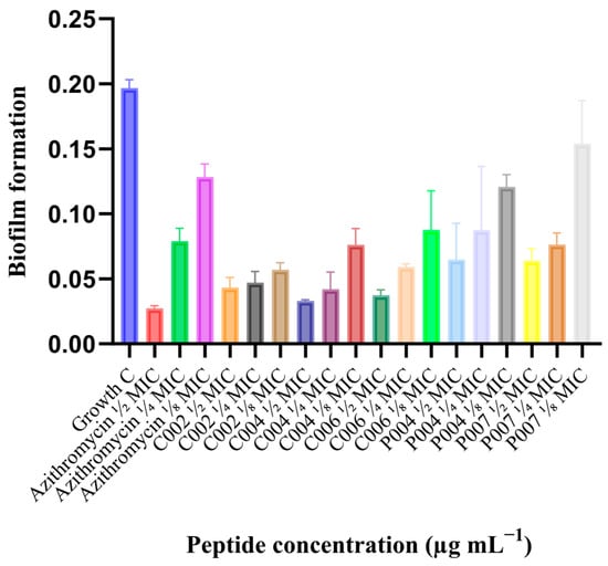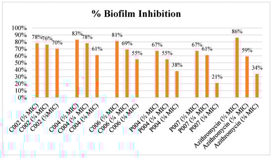Biofilm inhibition by dipeptide coumarin conjugates (C002, C004, and C006), tripeptides (P004 and P007), and azithromycin at ½ MIC, ¼ MIC, and ⅛ MIC. Data are presented as mean ± SD.
